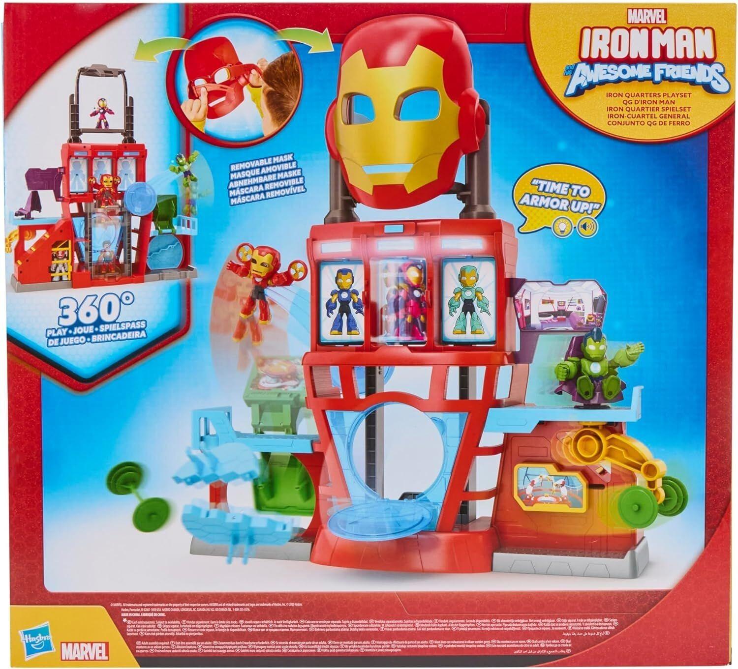 Join Iron Man and his heroic allies in thrilling adventures with the Iron Quarters Playset. This dynamic 2-in-1 Marvel playset features a removable Iron Man role-play mask, allowing kids to step into the shoes of their favourite hero. Packed with interactive elements, the playset includes a falling screen, smashable wall, lift for armour hoisting, stair-to-slide trap, and a flying arm, bringing action-packed excitement to every mission.Designed for children aged 3 and up, this playset comes with poseable 3-inch Iron Man and Ultron action figures, along with five accessories, including Ultrons spear, two barbells, and two helmets with wings. The electronic lights and sounds enhance the immersive experience, making every battle feel larger than life. Expand the adventure by collecting additional Marvel action figures and vehicles, featuring characters like Iron Hulk, Ironheart, Black Panther, and Ultron.*Features:** Kids ages 3 and up can imagine armoring up as Iron Man, with the Iron Quarters Playset, featuring a removable, wearable mask, that makes a great addition to any costume* This Marvel playset features over 40 electronic sounds and phrases from the Disney Jr. series Iron Man and his Awesome Friends, such as, Time to armor up! (speaks in English only)* The Iron Quarters playset includes 2 poseable action figures with character-inspired accessories, including Ultron’s spear, 2 pieces of Iron Man armor, and Hulk’s barbells* Place the included 3-inch (7.6 cm) Iron Man action figure on the elevator, then raise the platform to automatically armor up with helmet and wing accessories, while activating lights & sounds* Flip down the green monitor on the second level of this Marvel toy to break through the gym wall below and send the included barbell accessories flying* Attach the included armored up Iron Man figure to the flight arm, then raise the arm to imagine launching into high-flying, booster jet-propelled action and adventure* The swivel chair on the second level of this Iron Man toy moves side-to-side, and is connected to a movable robot claw below, which can hold accessories in a c-grip claw*Suitable for Ages 3+*