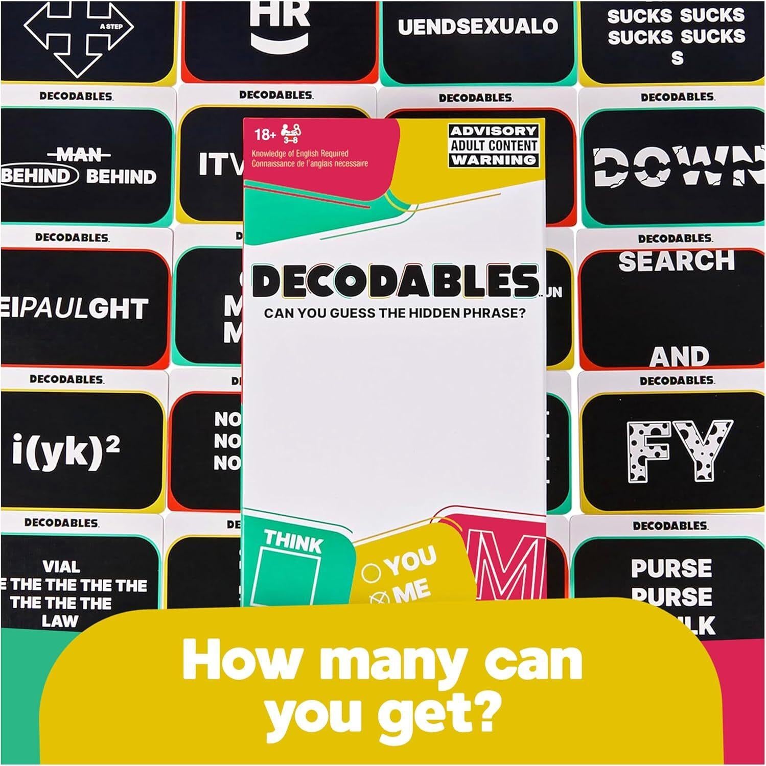 *Decodables*Can you guess the hidden phrase? Be the first to figure out the tricky answer depicted on the card and shout it out for the win. A rotating judge holds a card up so only they can see the answer. Everyone else tries to decode the phrase. Whoever figures out the phrase first wins the card. Test your brainteaser solving ability with word puzzles from this adult party game with answers that range from tame to adult. First to decode three cards wins!Crack the Code: Be the first to figure out the cleverly coded phrase on the card. Guess the Hidden Phrase: A judge holds a card up so only they can see the answer. Adult Brain Game: Get on the same wavelength.*Features:** 2–8 Players* 15–30mins* Ages 18+
