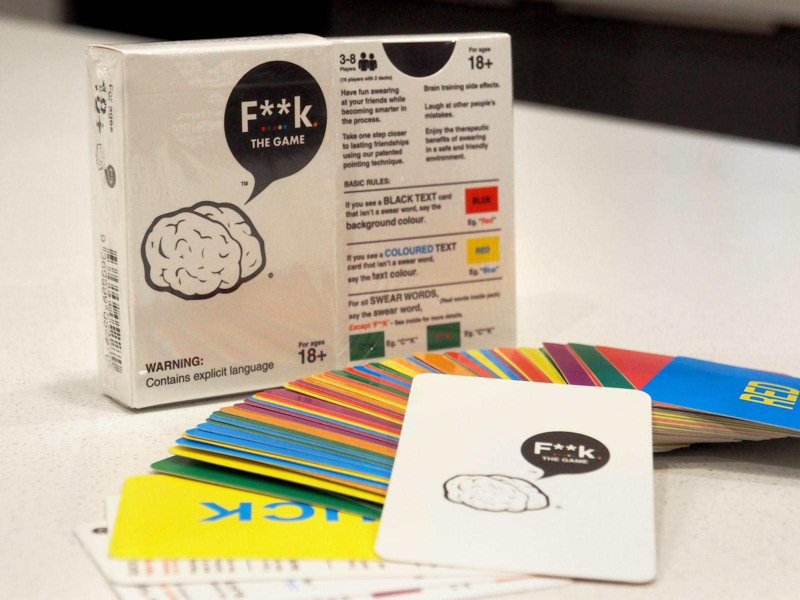 *F""k. The Game is a hilarious new Aussie card game which will help you get smarter while swearing at your friends.*It sounds simple, but the cards use a psychological phenomenon – the Stroop effect – known to mess with your head and delay your brain’s response. Players can’t help but f\*\*k up, sending the group into fits of laughter. Once you’ve mastered the basics, you can take the game to a whole new level with more rules, more strategy and you can even create your own rules.*How do you play?*This is a great social card game that will f\*\*k with your head by using a hysterically tricky combination of colours and swear words:* Players take turns to flip over a card and shout out what they see.* Depending on your card, you might say its background colour, its text colour or a swear word.* Keep playing until someone f\*\*ks up and is forced to pick up all the cards.* The winner is the first player to get rid of their cards.*Players:* 3 – 8*Playtime:* 15 – 30 Minutes*Suitable for ages 18 & up*