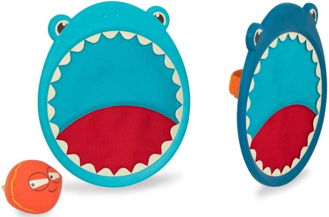 Toss, catch, and release – with Finley the Shark and a little fish! This shark-themed Critter Catchers playset comes with 2 hook-and-loop paddles and 1 ball. The silly ball is made out of fabric that easily sticks to the paddles, which in turn are easy for little hands to grip and come with adjustable straps.Bring this outdoor game set to the park, play in the backyard, toss at the beach, catch at a picnic, or take them with you on a summer vacation! Playing this toss and catch game keeps kids active, promotes healthy development, and improves hand-eye coordination.And because we at B. keep the environment in mind, parents will also be happy to know that our packaging is 100% recyclable.*Features:** Outdoor playset for toss and catch games.* Includes 2 shark-shaped paddles and 1 ball.* Throw the fabric ball and watch it stick to the hook-and-loop paddle!* Keeps kids active and improves hand-eye coordination.* Suitable for ages 3 and up