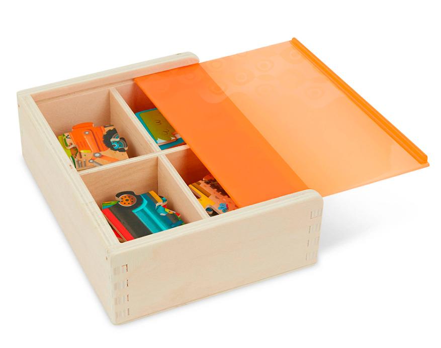*B. Wooden Puzzles in a Box – 4 Puzzle Set*The set includes four wooden jigsaw puzzles each stored in a separate compartment of a sturdy wooden box! The slide-on box lid doubles as a convenient puzzle board! Each puzzle piece is shape-coded on the back for easy sorting. Great for travel!*Features:** From Melissa & Doug range of quality wooden toys* Include four wooden jigsaw puzzles.* Comes with a slide-lid storage box*Suitable for ages 3 & up*