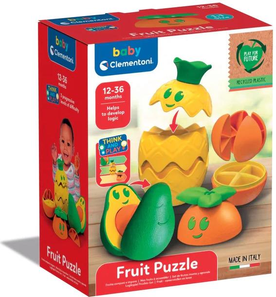 *Baby Clemmy: Play for the Future – Fruit Puzzle*Three very colourful fruits for nourishing the mind and developing logical thinking in small children! A refined “Made in Italy” design for a premium-quality game made of recycled plastic. The different fruits to be assembled develop logic skills through games that become gradually more difficult and unlock your child's abilities.*Features:** The avocado opens and conceals a ball that must be removed and put back in.* The pineapple is made up of stackable elements, the orange opens and conceals 4 slices to be removed and put back inside.* Each fruit stimulates different manual exercises and various sensory experiences thanks to their textures.* Conceived, designed and developed in Italy.*Specifications:** *Brand:* Baby Clemmy* *Suitable age:* 12–36 months* *Size:* 24 × 19.5 × 11.5cm, Weight 450g