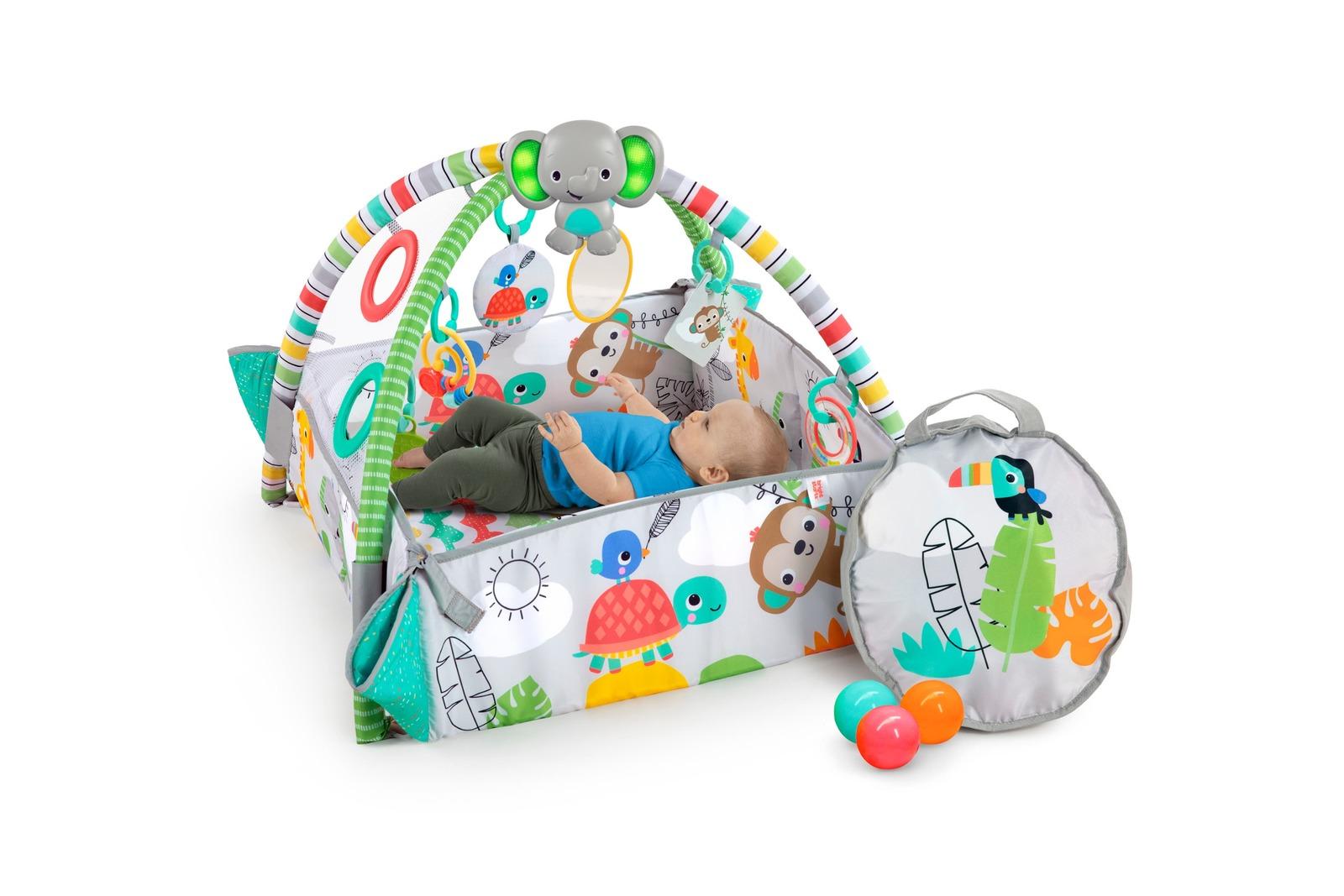 *Bring the joy of a ball pit right to your living room with the Bright Starts 5-in-1 Your Way Ball Play Activity Gym & Ball Pit.*With 5 ways to play, this activity mat is super flexible for whatever your baby’s age or stage needs. You can even adjust the plush walls down or up to fill the play gym with 40 colorful balls, making the joy last through the toddler years! Mom and dad can get in on the action (and get lots of co-play bonding time) by dropping the balls through the mesh canopy hole.As baby grows up, he can practice motor skills by dropping the balls himself! For younger babies, the jumbo playmat lays flat for tummy time (psst, we even added in a tummy time prop pillow). The cheerful elephant toy plays music and lights up to catch and keep baby’s attention. You’ll love the Totally Tropical fashion complete with toucans, palm trees and more.Playtime is all around with 6 additional toys: bead chaser, safari-themed crinkle toy, baby-safe mirror, flash cards, hanging leaf toy and bead rattle. Who’s ready to have a ball with Bright Starts?.*Features:** Includes 7 tropically cool take-along toys – elephant musical toy, crinkle toy, mirror, flash cards, hanging leaf toy and bead rattle* Mesh canopy hole* Baby's develops motor skills by rolling or passing the balls back and forth* Cheerful elephant toy lights up and plays over 20 minutes of music* Includes 40 balls with carrying case for easy storage* Machine washable mat and easy-to-clean wipeable toys* Dimensions: 76.2 × 113.03 × 53.34cm* Age Suitability: 0 Month & Above* Battery Type: 3× AA Batteries (Not Included)