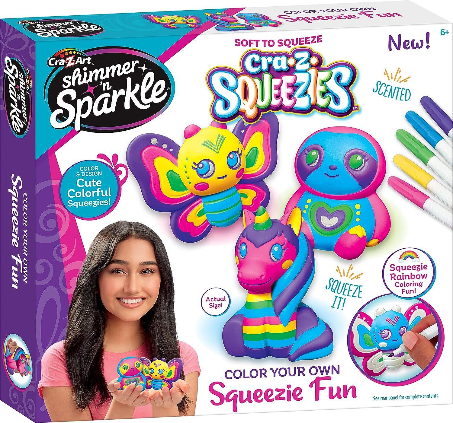 *Shimmer ‘n Sparkle Cra-Z-Squeezies Color Your Own Squeezies kit is such a fun arts and crafts activity*Included are 3 squeezies that are scented, along with 5 vibrant makers. Shimmer ‘n Sparkle Squeezies are super soft and satisfrying to squeeze. Shimmer ‘n Sparkle Cra-Z-Squeezies Color Your Own Squeezies has 2 play patterns – first color your own, making them as colorful as you’d like and secondly enjoying the satisfaction of squeezing. They are slow rising making them great stress relivers as well. They are super fun to play with no matter how you squeeze them and they will always return to their original shape and size. Shimmer ‘n Sparkle Cra-Z-Squeezies Color Your Own Squeezies comes with 3 squeezies and 5 markers – a great arts and crafts kit great for ages 6 and up.*Features:** Color and design cute and colorful squeezies to collect or give away* Sweet scented squeezies are soft and squishable.* These squeezies give such great squeeze satisfaction with slow rising squishy fun* Shimmer ‘n Sparkle Cra-Z-Squeezies is great for ages 6 and up*Set Contents:** 3 awesome squeezies; butterfly, unicorn and owl* 5 vibrant markers used to customize your squeeze* Basic instructions*Suitable for ages 6 & up*