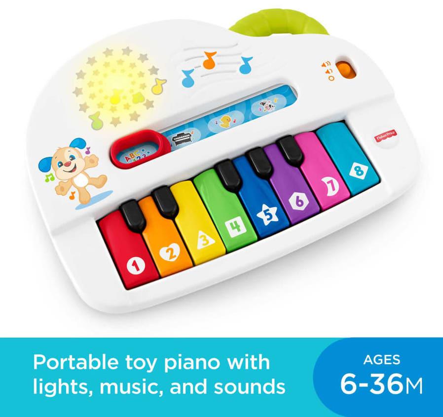 *Fisher-Price: Laugh & Learn Silly Sounds Light-Up Piano*With four ways to play, the Fisher-Price® Silly Sounds Light-Up Piano keeps your mini-musician busy “composing” and learning all playtime long.As your baby presses the keys of this light-up piano, they're rewarded with either real piano notes, delightful duck sounds, silly cow sounds, or playful songs and phrases about colors, numbers, and shapes! And with an easy-grasp handle, you can take the silly musical fun wherever you and your baby go!As your mini-Mozart progresses from batting at the keys to using their little fingers to push each key, and grasping the slider to move it back and forth, they're strengthening dexterity and hand-eye coordination. *Features:** Take-along piano toy with 4 ways to play!* Real piano notes, duck sounds, cow sounds, and learning content* Press the 8 numbered keys to activate lights, songs, and sounds * Slide the slider to switch between each play mode* Easy-carry handle for take-along play* Batteries: 3 x AA*For infants and toddlers ages 6–36 months*