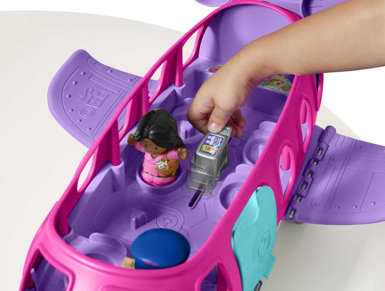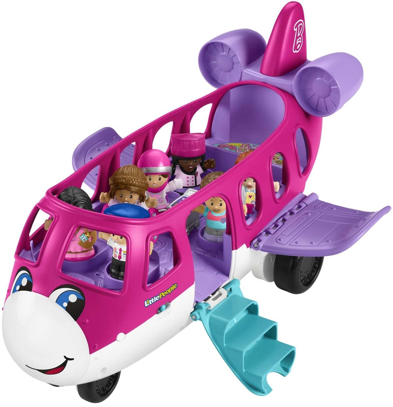 Toddlers can take to the skies for imaginative adventures with the Barbie Little Dream Plane by Little People. This push-along toy airplane features a light-up nose and fun music, sounds and phrases to enhance your toddler’s storytelling play.*Features:** Features a light-up nose and fun music, sounds and phrases to enhance your toddler’s storytelling play.* Kids can board the 3 toy figures onto the plane, stow luggage, serve beverages from the sliding cart, and send the crew and passengers soaring into all kinds of exciting Barbie adventures.* Colors and decorations may vary.* Suitable for ages 18 months – 5 years