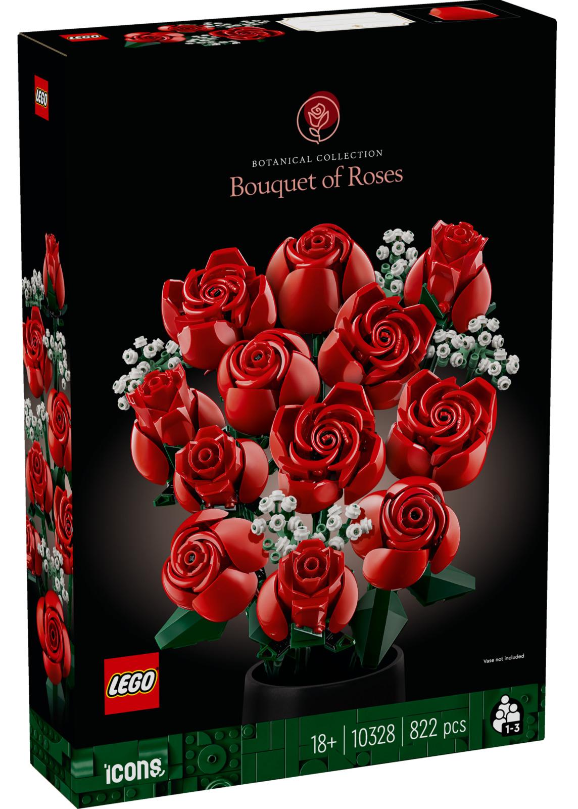*Let creativity bloom with the LEGO Botanicals Bouquet of Roses building set for adults – a timeless gift of 12 roses from the LEGO Botanical Collection.*Take time out with the LEGO Botanicals Bouquet of Roses (10328) home decor building set for adults. Indulge in a mindful building project or treat a loved one to this timeless buildable bouquet – a perfect gift idea for Valentine’s Day or any other special occasion. A joy to build, this LEGO bouquet depicts a dozen red roses, including 4 in full bloom, 4 blooming and 4 in bud, with long green stems for vase display, plus 4 sprigs of baby’s breath with small white flowers. Easy to assemble, the bouquet makes an elegant display for any space and is combinable with other sets from the LEGO Botanical Collection.This set comes with 6 brick bags and separate instructions for the 3 flowering stages, making it perfect for solo or group construction. A digital version of the building instructions is available in the LEGO Builder app. Discover a space for relaxation with the inspiring range of LEGO creative building projects designed specifically for adults.*Features:** Indulge yourself in a mindful project with the LEGO Botanicals Bouquet of Roses* Includes everything you need to craft a dozen red roses with long green stems* Plus 4 sprigs of baby’s breath with small white flowers* The kit depicts roses captured at various stages of flowering* Including 4 roses in full bloom, with 4 blossoming and 4 in bud* Add a splash of colour with this zero-maintenance bouquet of roses* Valentine’s Day gift idea – Designed for adult fans of LEGO® building sets* The tallest rose in this 822-piece building set measures over 31 cm long*Specifics:**Item:* 10328*Pieces:* 822*Ages:* 18+