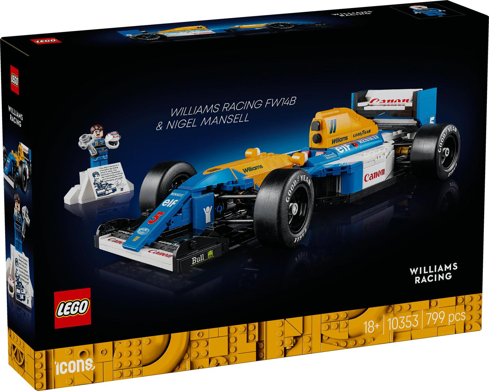 *LEGO Williams Racing FW14B & Nigel Mansell F1 race car set*Hail the history of F1 innovation with the LEGO Icons Williams Racing FW14B & Nigel Mansell (10353) home and office desk decor model building kit for adults. Craft a replica of the legendary F1 race car that propelled Nigel Mansell to victory in the 1992 Formula 1 World Championship. Complete with a Nigel Mansell minifigure, this premium display model makes a captivating centrepiece and a great Christmas or birthday gift for fans of F1.The LEGO Icons Williams FW14B features working steering, wide rear slick tyres with printed Goodyear lettering and a detailed engine, plus a display stand with vehicle details and stats. The Nigel Mansell minifigure comes with a helmet and a podium-style display stand featuring a photo and a quote from the legendary driver. Discover the dynamic range of LEGO F1 building sets designed for adults, kids and families. The LEGO Builder app features a 3D version of the building instructions included with this collectible race car construction kit.*Features:** LEGO Icons Williams Racing FW14B & Nigel Mansell race car set for adults* With a LEGO F1 Williams Racing FW14B race car and a Nigel Mansell minifigure* LEGO F1 race car with working steering, wide rear tyres and a detailed engine* Includes desk decor display stands for the race car and Nigel Mansell minifigure* Give this building set as a Christmas or birthday gift for fans of F1 racing* The LEGO Builder app includes a 3D version of the building instructions* Discover a dynamic range of LEGO F1 sets (sold separately) for the whole family* The Williams Racing FW14B car in this 799-piece set is over 31 cm (12 in.) long*Specifics:**Item*: 10353*Pieces*: 799*Ages*: 18+