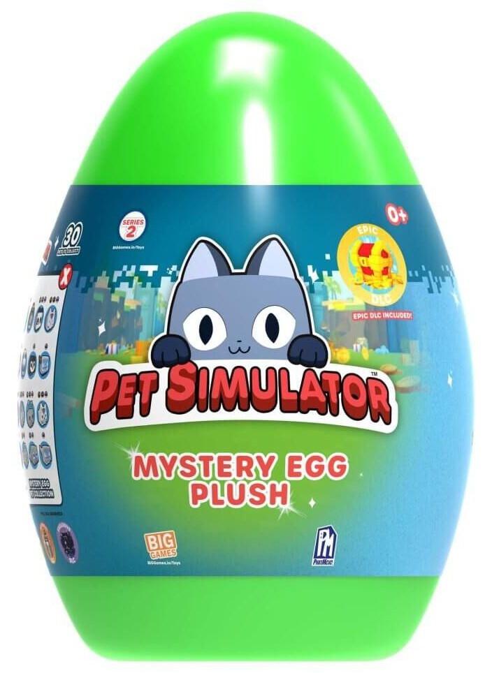 *Pet Simulator: Mystery Egg Plush – Series 2 (Blind Box)*What kind of pet did you get? Crack open the egg and find out, with the PET SIMULATOR Mystery Egg Plush! Collect all 12 of your new, mystery plush pets from the hit game. Series includes Gold, Dark Matter, and Rainbow chase pets. Each egg contains one, 6-inch, mystery plush, and a DLC code. Build your pet collection today!*Features:** Mystery: Each egg contains one, 6-inch plush.* Collect Them All: Includes 12 collectable plush; featuring Gold, Dark Matter and Rainbow chase pets.* Valuable DLC: Each pack includes Epic DLC Code!* Officially Licensed: Genuine PET SIMULATOR merchandise, by PhatMojo.*Suitable for Ages 1+*_Please Note: This item is a Blind Box and so we cannot accept Returns on this product._