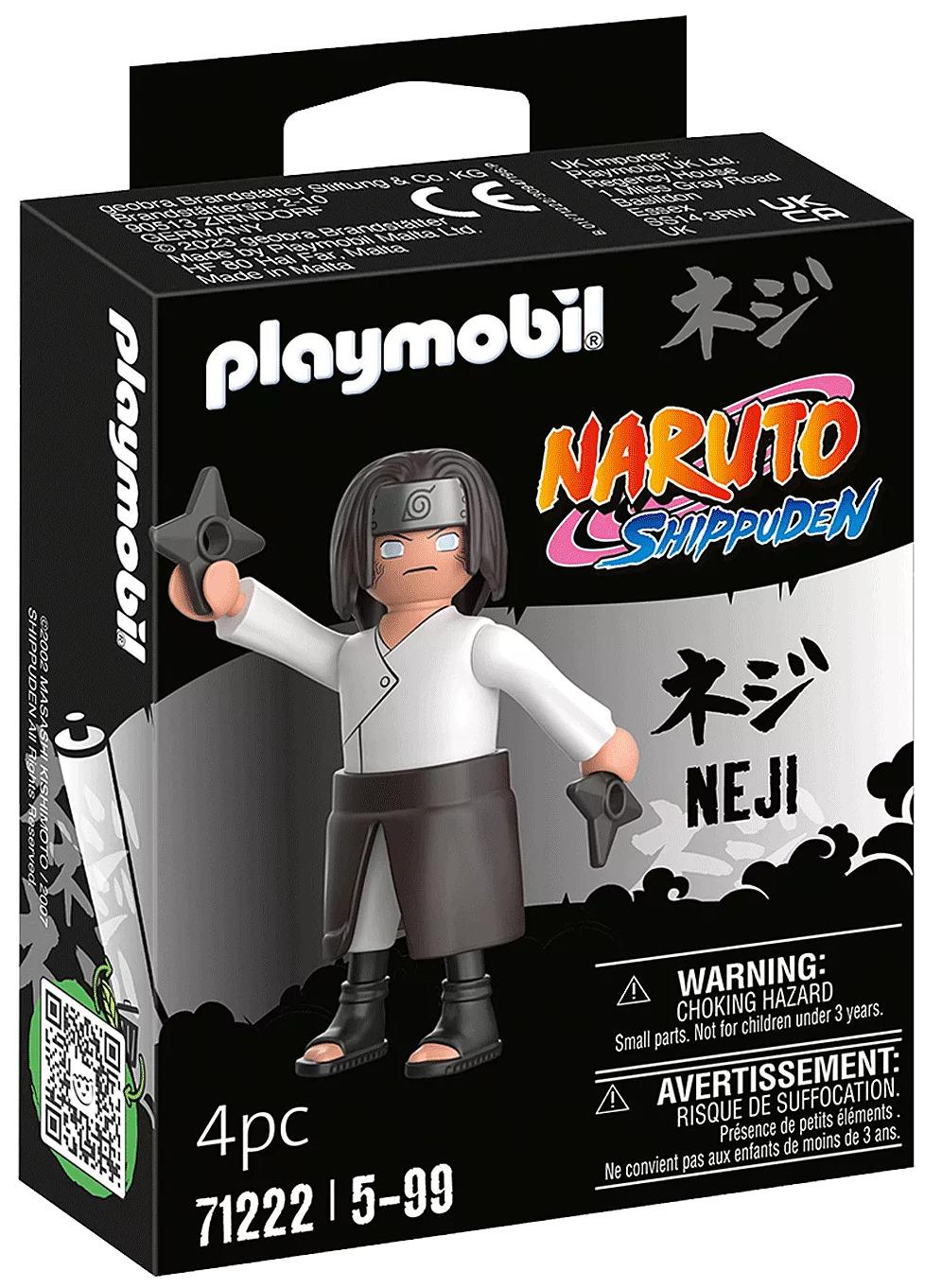 *Playmobil: Naruto Shippuden – Neji (71222)*Neji is a calm and level-headed character of the Hyuga clan from Hidden Leaf Village and Naruto's helper in the search for Sasuke.The PLAYMOBIL Anime universe continues to expand! All anime fans can look forward to new characters from the exciting NARUTO universe. The creative figures captivate with many details and cool accessories from the popular successful series and are a real eye-catcher in any fan merchandise display. The PLAYMOBIL set includes the NARUTO SHIPPUDEN character Neji with two shuriken. The silicone skirt is removable. For a secure display, the figure can be placed on the stand plate.*Contents:** Figures: 1 Neji;* Accessories: 2 throwing stars, 1 removable silicone skirt, 1 stand plate*Suitable for Ages 4+*
