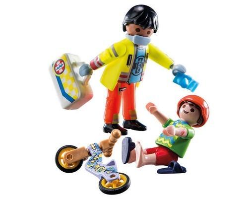 *Playmobil: Paramedic with Patient (71245)*The Paramedic treats the injured boy with plaster labels and a splint bandage!The caring paramedic is always ready to help. For the initial treatment of injuries, he has his first-aid kit with splints and plenty of bandages. He carefully treats the wound of the injured boy and applies a splint to his leg. The funny dinosaur plaster makes the little patient smile again in no time. A great souvenir or gift for little paramedics.*Contents:** Figures: 1 paramedic, 1 injured child;* Accessories: 1 scooter, 1 first-aid kit, 2 bandage splints, 1 helmet, 1 label sheet with bandage material*Suitable for Ages 4+*