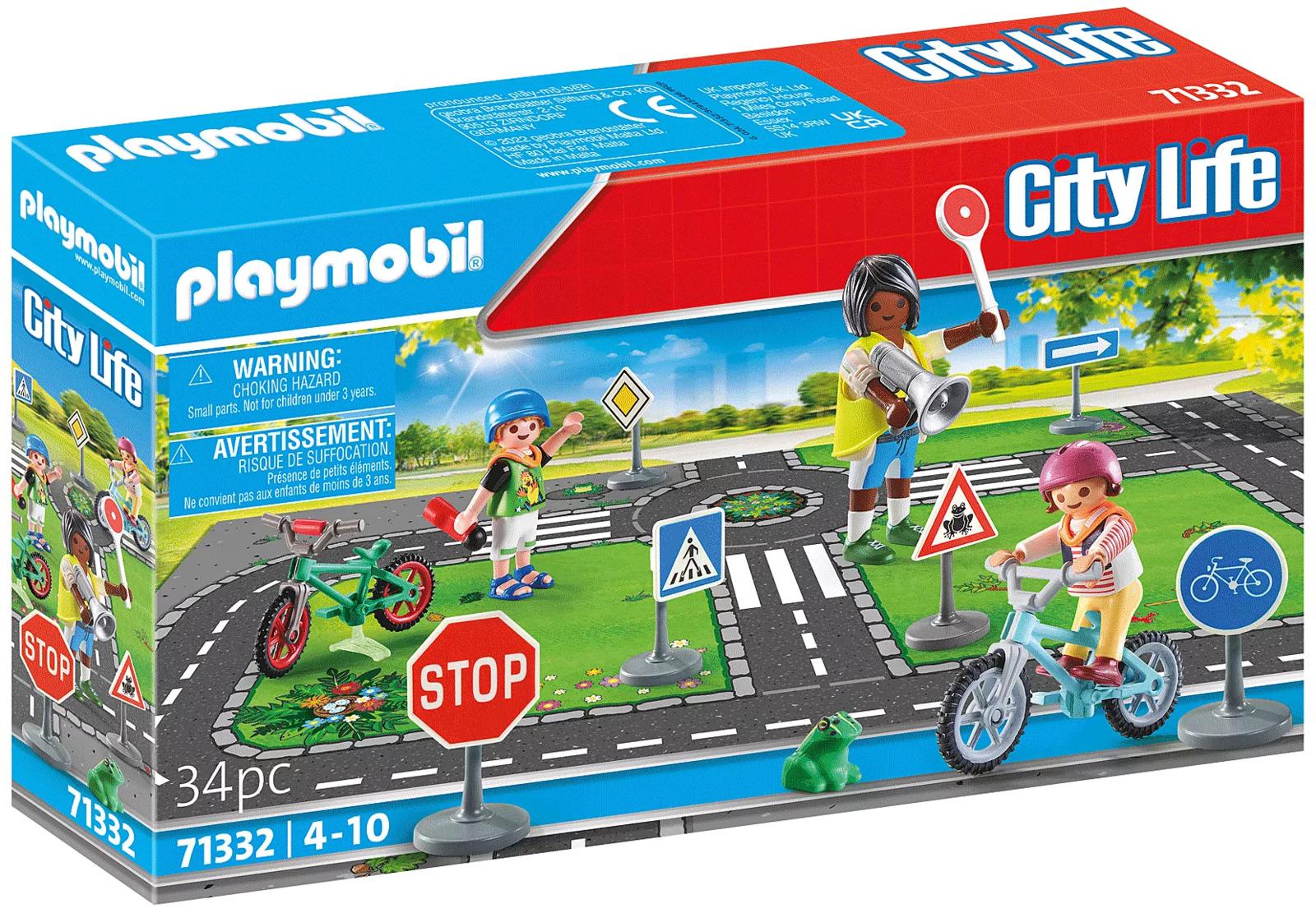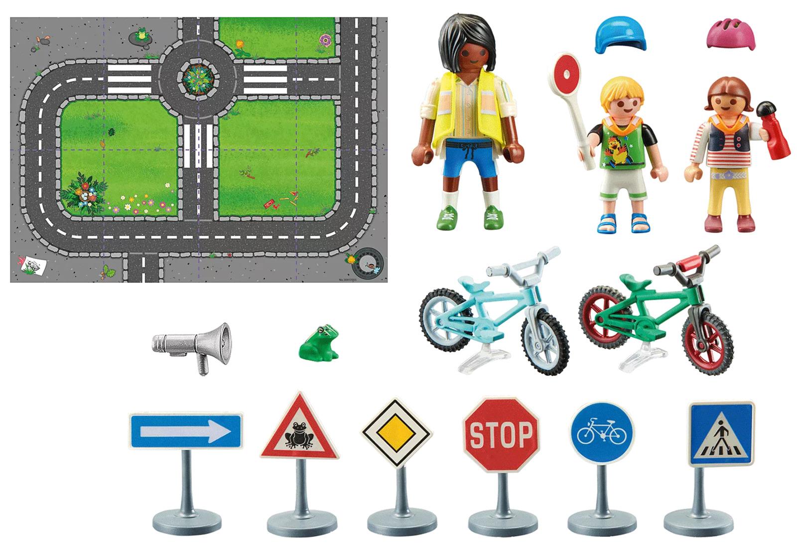 *Playmobil: Traffic Education (71332)*Stand on red, walk on green – traffic education is child's play and even more fun in the schoolyard! Here, students learn the meaning of the various traffic signs and the traffic lights so that they are always safe on foot and on their bikes.Proper behavior in traffic is important for schoolchildren. To get to school and back home safely, the children practice all the important rules in the Traffic Education Class. When am I allowed to cross the street, where are danger spots, what is particularly important to pay attention to in road traffic? With the bicycle course playset from PLAYMOBIL, traffic education is fun! The detailed toy set playfully introduces children to the topic of road traffic and encourages them to recreate the rules at home and reinforce what they have learned.*Contents:** Figures: 1 woman, 2 children;* Animals: 1 frog;* Accessories: 1 road cardboard, 6 road signs, 2 bicycles, 1 megaphone, 1 trowel*Suitable for Ages 4+*