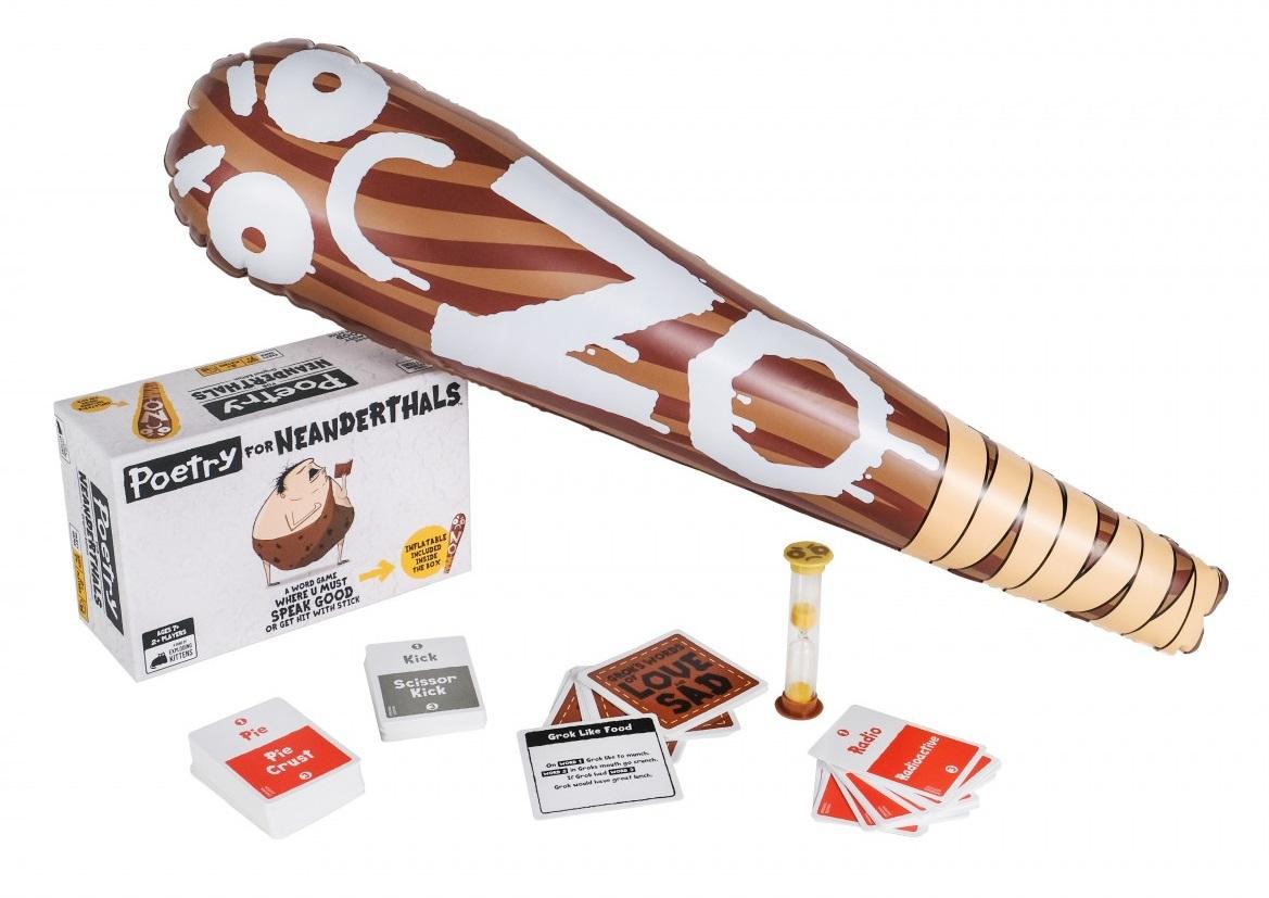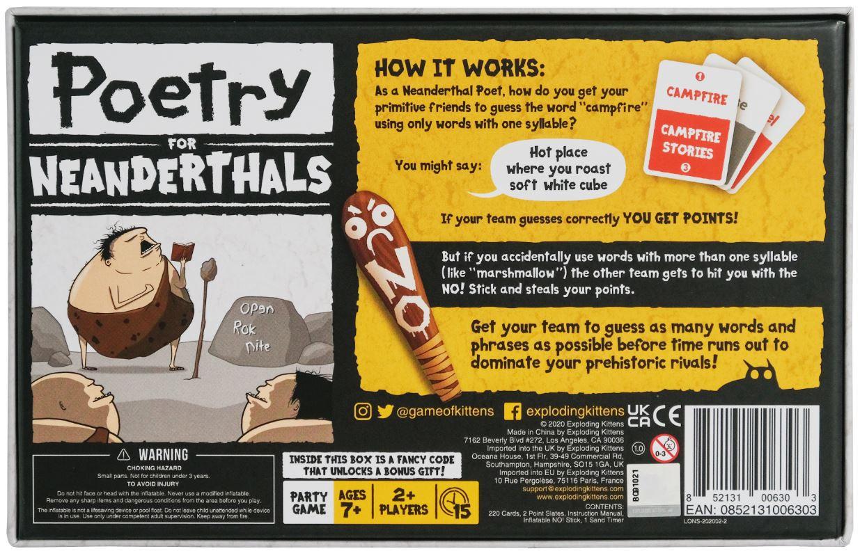 Experience poetry like never before with Poetry for Neanderthals, the family-friendly party game from the creators of Exploding Kittens. In this game, players must earn points by getting their teammates to guess words and phrases using only single-syllable words. But watch out! If you slip up and use a multi-syllable word, you'll get bopped with a 2-foot inflatable club by the opposing team. With 400 double-sided cards, hilarious illustrations by Matthew Inman of The Oatmeal, and quick gameplay that takes just 5 minutes to learn and 15 minutes to play, Poetry for Neanderthals is the perfect addition to your game night. So gather your tribe, grab your club, and let the poetry begin!
