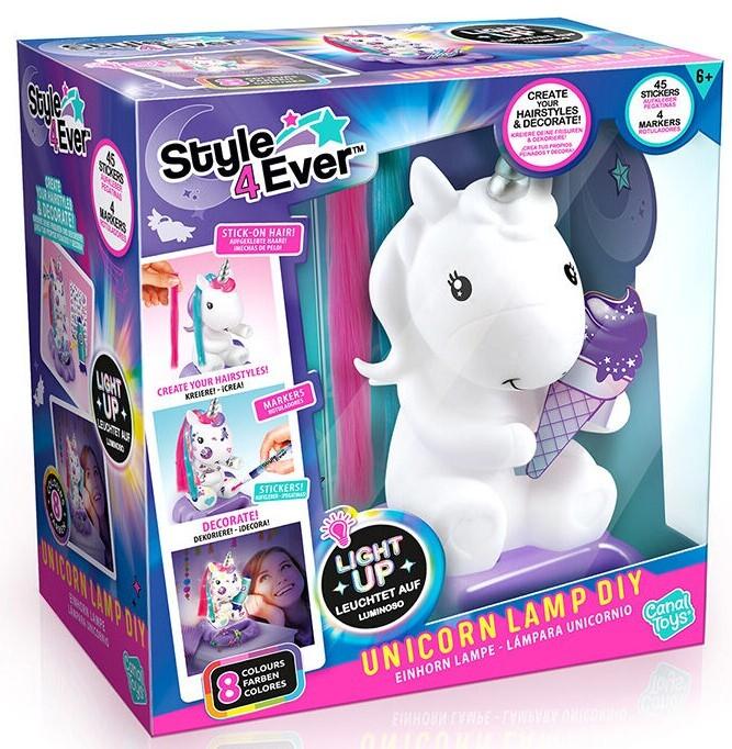 *Style4Ever: Unicorn DIY Light-Up Lamp*The DIY Unicorn Lamp is a beautiful LED night light to decorate with stickers, markers and accessories to detach. You can create your own hairstyles with adhesive and removable hair locks. A creative activity and a perfect bedroom decoration for unicorn fans!*Features:** Manual Activity: Decorate the unicorn with glitter stickers, gems and glitter glue. Create your own hairstyles and decorate your unicorn with the 4 hair locks provided. Hair locks are adhesive and removable. Clean the adhesive with water to regain its stickiness and reuse it.* Personalization: Personalize your unicorn by choosing its accessory of the moment: ice, skateboard, surfboard or microphone. Simply detach these precut elements from the packaging and place it between the arms.* Storage: Storage compartment included on the cloud shaped base. Ideal to put small objects (jewelry, scrunchies, barrettes, coins …).* Fun & Playful: A creative, fun and educational activity suitable for children from 6 years old. Vinyl unicorn, perfect to decorate a room during the day and relax at night thanks to its soft light.*Suitable for Ages 6+*_Required: 3× AAA Batteries (not included)_