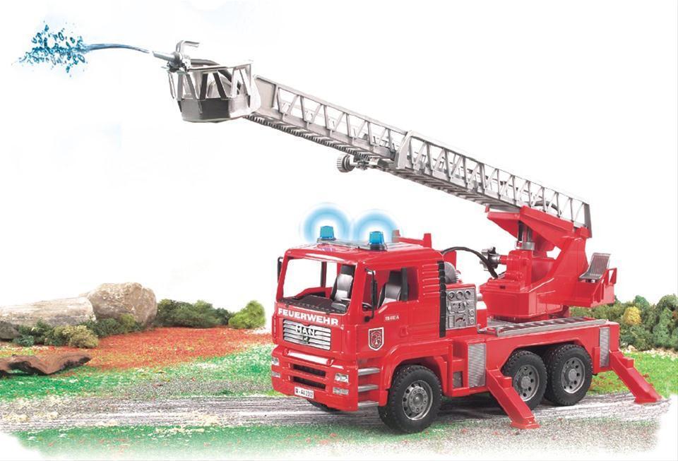 MAN Fire EngineRush to the rescue with the lights flashing and sirens wailing on this realistic fire engine. Covered in bells and whistles, this high-quality 18" plastic truck is sure to inspire hours of heroic and imaginative play.A working siren, flashing lights, tilting cab, detailed engine, folding mirrors, folding stabilizer legs, and an extendible, rotating ladder are all here, but most important is the fire hose that shoots a powerful stream of water.* Includes 2xAAA batteries* Dimensions: 47cm x 18cm x 24cm* Age: 3+*Made in Germany*_Bruder is a German company whose products are developed as model-sized toys. These high quality toys encourage children to imitate real life in the form of role playing. The high level of functionality of the toys help children understand the technical world by allowing them to “grasp by grabbing.” Special attention is paid to the well-balanced interaction of easy-to-handle play functions and models that are true to life and offer the greatest possible level of stability._