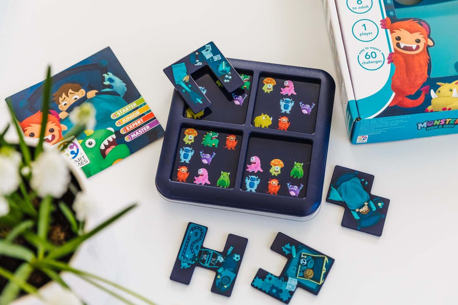 Are there any monsters under the bed? Place the 4 puzzle pieces on the game board, to hide all monsters – except the ones pictured in your challenge. 60 challenges included in a travel-friendly case.1\. Choose a challenge. 2. Arrange the four puzzle pieces on the game board so that all the monsters are covered except the ones pictured in the challenge. 3. You’ve solved the puzzle! Sounds easy? Wait till you try the expert challenges……these monsters will soon have you screaming with frustration! Suitable for ages 6+*Features:** 1 Players* Ages 6+