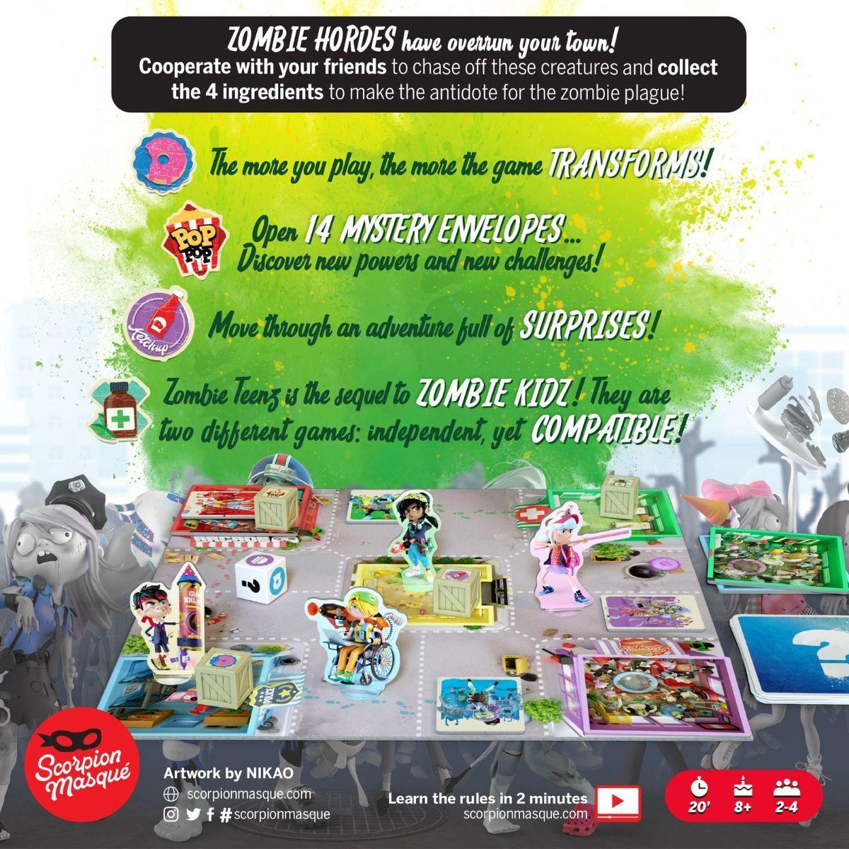 *Zombies are attacking the entire town! Cooperate with your friends and launch an expedition to drive off the overwhelming hordes. Collect the 4 Ingredients and brew the antidote that will save the world!*Zombie Teenz: Evolution is the sequel to Zombie Kidz: Evolution (#1 Kids' Game on BGG). It is a standalone game with a different set of rules, so you don’t need to have played the first game to jump into the second. The rules are slightly more advanced and will require a little more strategic thinking. ZZombie Teenz: Evolution follows the same general guidelines as its predecessor: a fast and simple game whose rules evolve from game to game through the opening of 14 ‘Mystery’ envelopes. By accomplishing special Missions, players unlock additional content that will provide a richer experience, while constantly renewing the enjoyment of the game. The icing on the cake: the two games are compatible! You will be able to play Zombie Kidz with your Zombie Teenz, and vice versa!*Game Contents:** Double-sided game board* Zombie dice* 4 Hero tokens* 8 Plastic standees* 13 Sealed Evolution envelopes* Rulebook/passport
