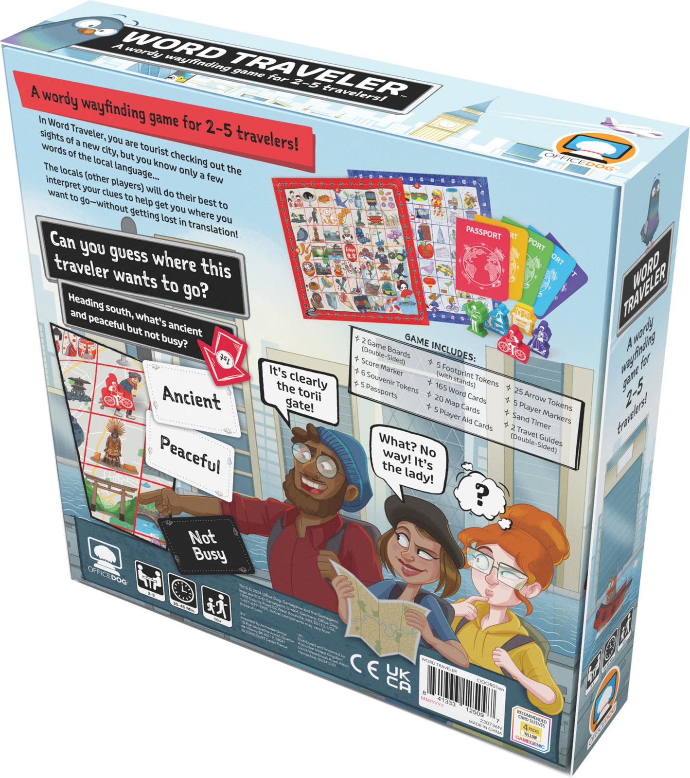 In Word Traveler, you are a tourist checking out the sights of a new city, but you only know a few words of the local language… The locals (other players) will do their best to interpret your clues to help get you where you want to go — without getting lost in translation!Great co-operative play pattern with little downtimeFun when players succeed and fun when players fail*Contents:** 2 Game Boards* 2 Travel Guides* 1 Score Marker* 6 Souvenir Tokens* 5 Footprint Tokens* 5 Footprint Stands* 165 Word Cards* 20 Map Cards* 5 Player Aid Cards* 25 Arrows* 5 Player Markers* 5 Passports* 1 Sand Timer*Features:** 2–5 Players* 30–45mins* Ages 10+