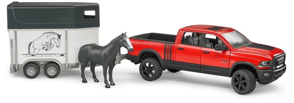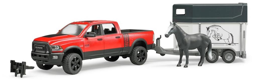*Just like the real thing, the toy features a crew cab with four doors. All doors open to accommodate four bworld figures.*This model at a scale of 1:16 features suspension on both axles to provide ride comfort and off-road capability. In this context, the front axle can be steered using the included steering wheel extension. The tailgate opens to transport loads and the loading area provides space for BRUDER pallets, pallet cages or straw bales (accessories BR2415/BR2342, not included).*Features:** The RAM can also be used as the tractor to pull the trailer.* Thanks to the trailer coupling, the horse trailer can take horses almost anywhere, be it to the paddock or to a ride out with friends, anything is possible with this combination.* The optionally available light and sound module (accessory BR2802) can be installed after having opened the sliding roof to further enhance the fun.*Suitable for ages 4 & up*