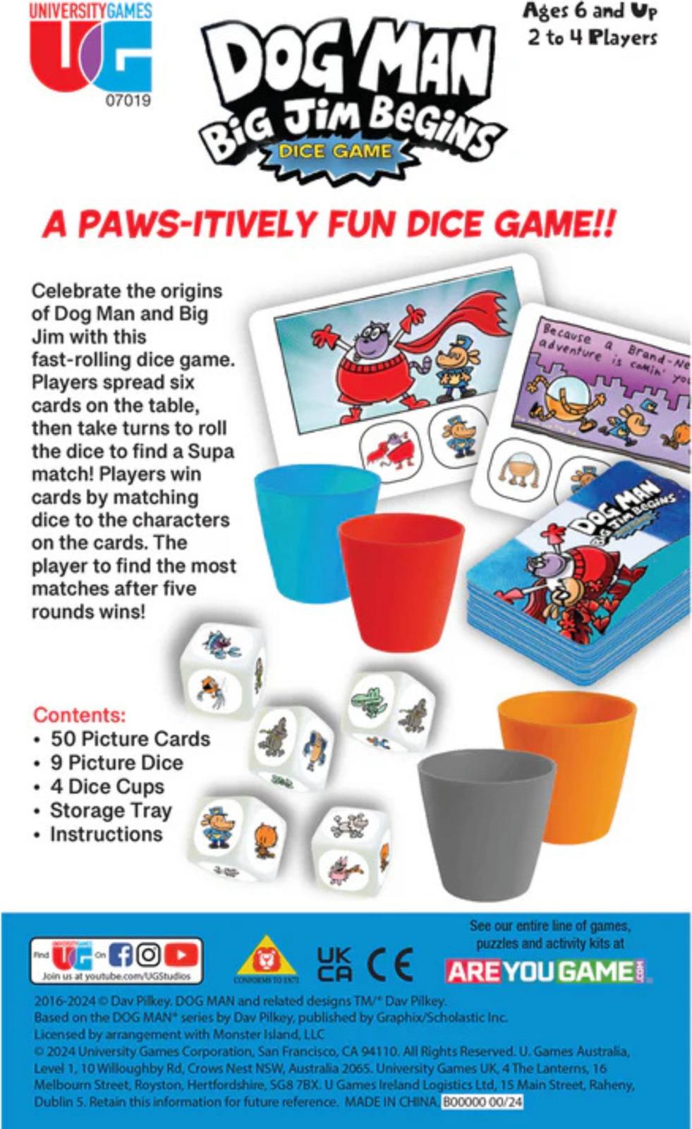 Get ready for some paw-some fun with Dog Man: Big Jim Begins Dice Game, based on the December 2024 Dog Man book release, Dog Man: Big Jim Begins! Roll the dice, match them to the cards, and be the first to complete 6 cards to win.Join your favourite characters from the book in this fast-paced, action-packed game that’s perfect for kids 6 and up. Fun, easy, and full of dice-rolling excitement!*Features:** 2–4 Players* Ages 6+