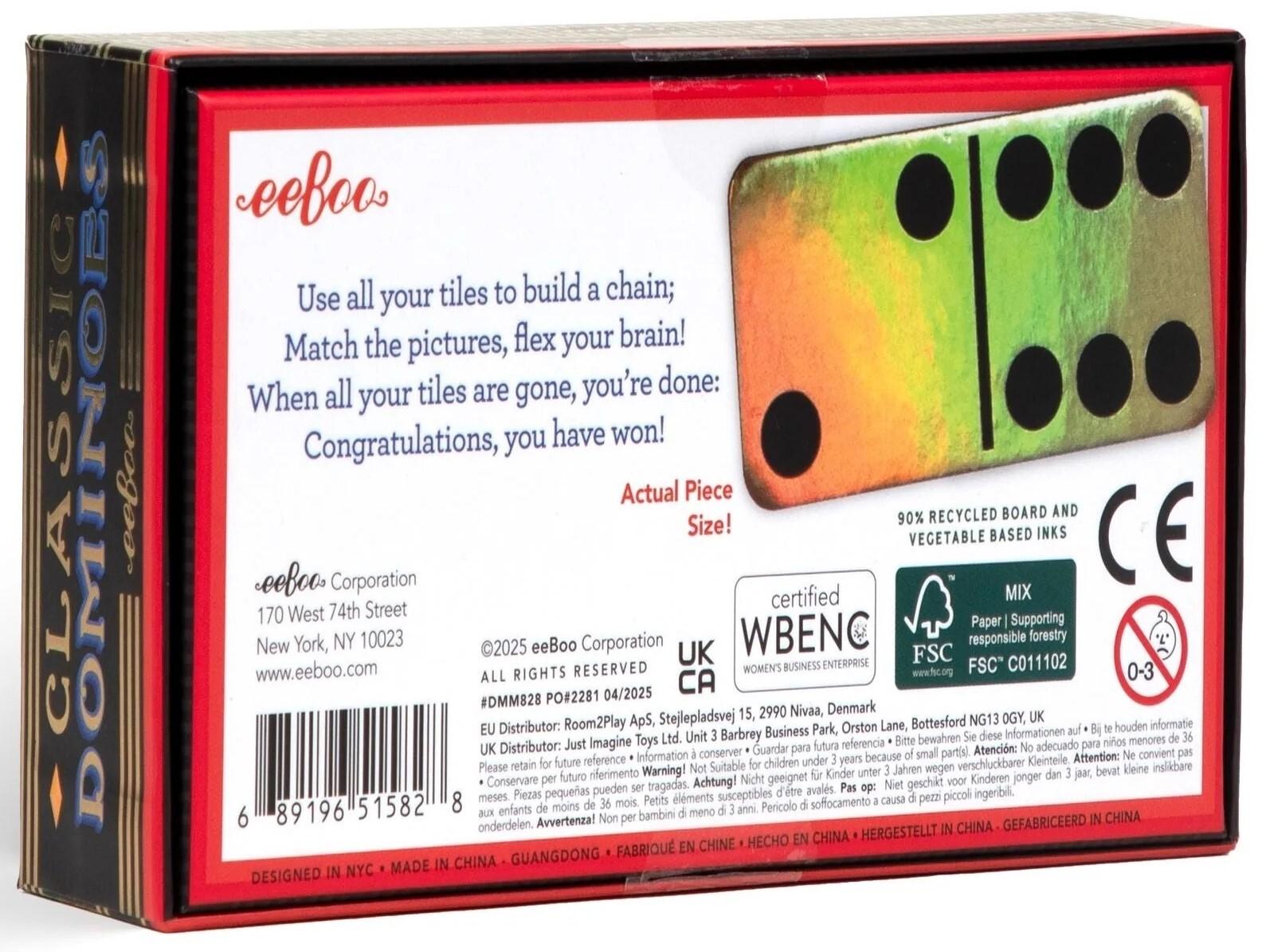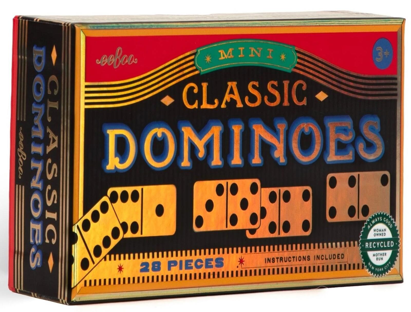 *eeBoo: Mini Dominoes – Classic*Enjoy a classic game in a mini, travel-friendly format with eeBoo’s Mini Classic Dominoes, beautifully illustrated by Nicolò Giacomin! This 28-piece set is perfect for kids and adults alike, offering a fun and engaging way to build matching, counting, and strategic thinking skills. Whether at home, on vacation, or during game night, these compact dominoes are easy to carry and store. The durable pieces ensure long-lasting play, while the eco-friendly materials and vegetable-based inks make this set a sustainable choice. The 6-pack display is a great addition to any store, gift shop, or classroom collection.*Features:** For 2–4 Players* Playtime: 15 Minutes* Age 3+*Contents:** 28× holographic, domino tiles* Instructions inside box top* Sturdy storage box*Specifications:** Develops Matching and Concentration Skills* Sustainably Sourced: Made with recycled board and printed on FSC®-certified paper using vegetable-based inks.* Pieces: 2.75” x 1.375”* Box: 6” x 3” x 1.5”