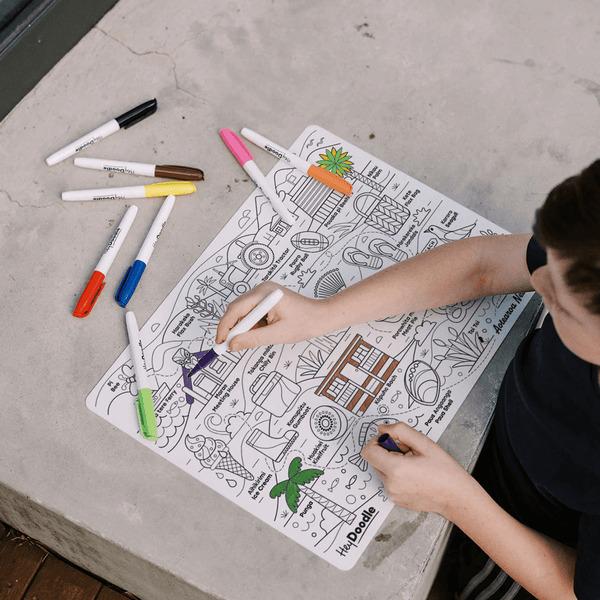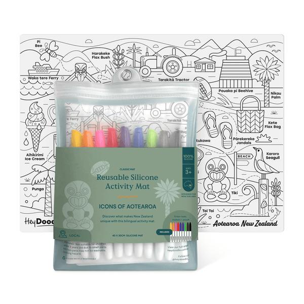 *Heydoodle: Icons of Aotearoa (Large)*Learn Te Reo while colouring in (with whiteboard markers – which are supplied) pictures of icons on Aotearoa.Best thing is, as with all HeyDoodle mats, they can be wiped clean and reused! Each mat is thoughtfully designed and features an educational theme (ie space, letters, farm animals, numbers) so your curious kids can learn as they trace, draw and colour!*Features:** An A3 reusable silicone mat* 9 markers for hours of colouring* A handy carry pouch (so you don’t lose anything while on the go!)*Suitable for Ages 3+*