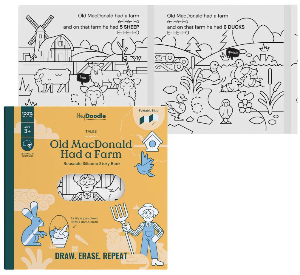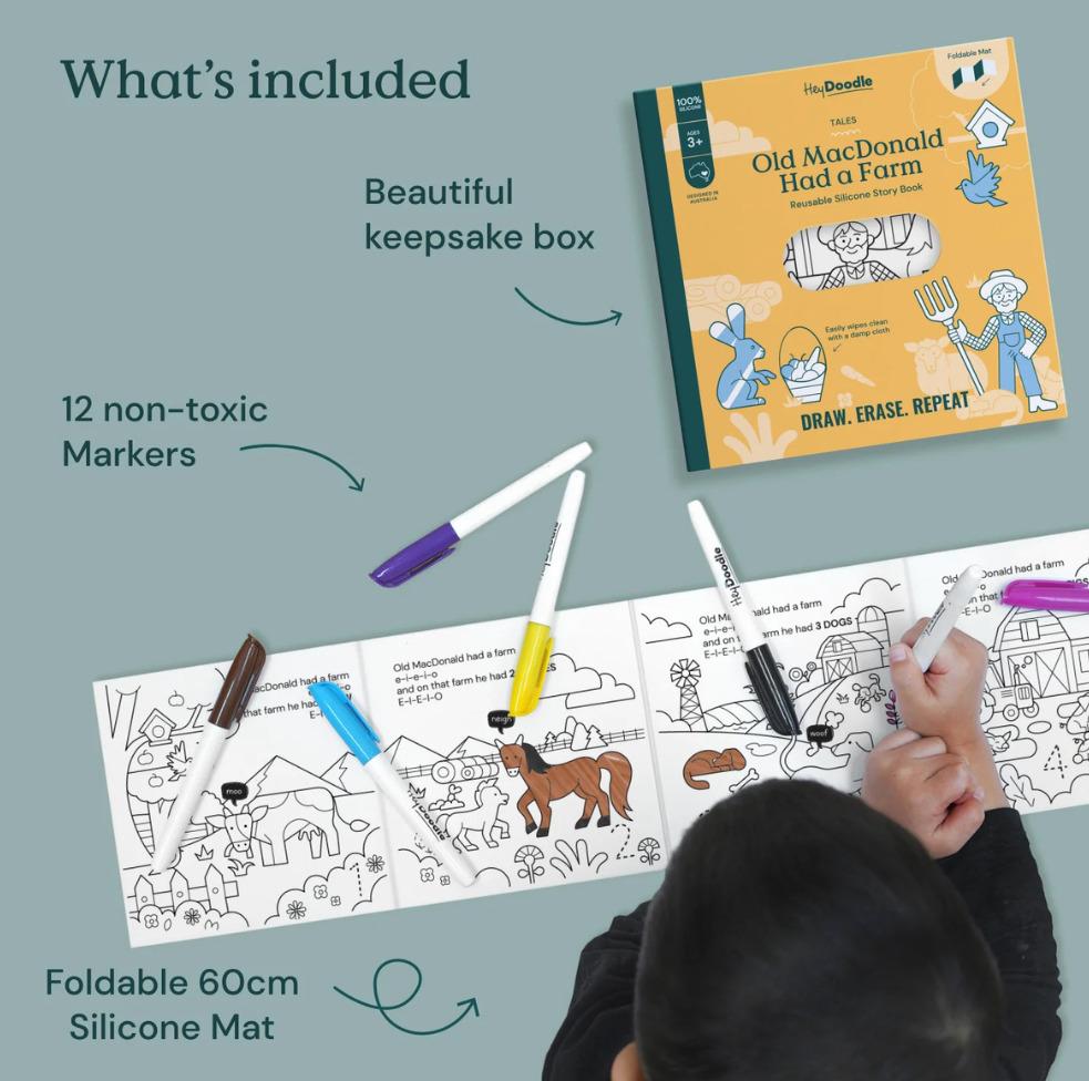 *Heydoodle: Old MacDonald Had a Farm (Large)*Practice writing the alphabets while learning the names of our furry,feathered and slimy friends. See how many blowing leaves and shiny starfishes you can find!Best thing is, as with all HeyDoodle mats, they can be wiped clean and reused!*Features:** Age: 3 years +* Approx Package Dimensions: 21 × 16 × 2 cm* Approx Product Dimensions: 40 × 30 cm* Contents: An A3 reusable silicone mat 9 markers for hours of colouring A handy carry pouch (so you don’t lose anything while on the go!)*Suitable for Ages 3+*