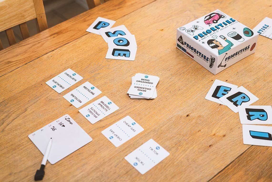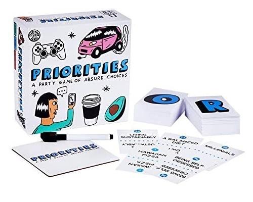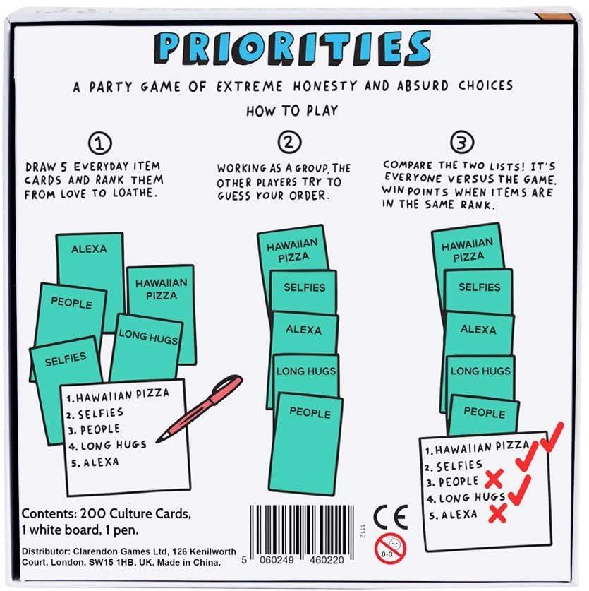*Priorities is the party game of absurd choices.*The hilarious game of absurd choices: Priorities is a crazy new party game that will have you questioning your own and your friends’ priorities. How well do they really know you?What’s more important to you: your new sneakers, climate change, or being right? What do you love more: kittens, your new girlfriend, or a long hug? Rank everyday items in your order of priorities and see how many the other players can guess correctly.Priorities is a contemporary co-operative game where your group work together to learn as much about each other as possible. Be careful though! The player choosing their priorities may not hint at their chosen order – it will be up to the others to get that right.*Features:** Takes 2 minutes to learn and plays in 30 minutes.* No lengthy rules manuals, no fiddly bits – just jump straight in and enjoy!* Perfect for 2 or more players and even better with a big group.* Ages 14+, ideal for a party, after dinner, or on holiday.*Game Contents:** 200 Culture Cards* 1 White Board* 1 Pen* 1 Rulesheet