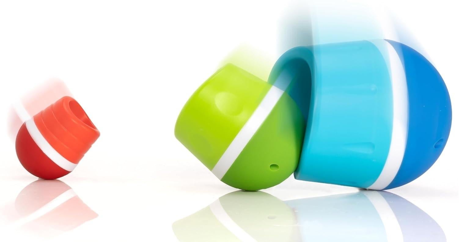 \*\*\*Fat Brain Toys: Tumbleroos\*\*Nest the smallest inside the other two – The moment you let go, the whole stack tips over and they all tumble apart, one at a time, to rock and wobble around and around. Little ones can't wait to nest and tumble again and again!Wiggly wobbly action is sure to launch the little ones into hours of tactile fascination with TumbleRoos.*Features:** TumbleRoos Set of 3 wobbly toys to nest and tumble Encourages fine motor skills, spatial reasoning, tactile exploration* Nest the smallest inside the other two Let go and watch them tumble apart and wobble, one at a time!* Unique, subtle textures to explore* Bright colours fascinate the eyes* Includes 3 TumbleRoos – Large, medium, small* Largest measures 4 inches in diameter, 4.25 inches tall