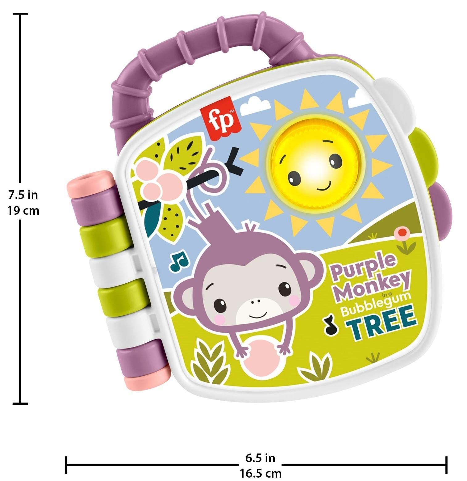 Baby can cuddle up with a familiar friend with this musical toy book that plays the popular Purple Monkey song from the best-selling Fisher-Price Deluxe Kick & Play Piano Gym\*! The Purple Monkey Musical Storybook features 2 easy-to-turn pages, adorable song-inspired illustrations, and printed song lyrics to encourage early literacy. Just press the sun button or turn the pages to activate the lights, music and sounds! The easy-grasp handle is sized just right for little ones to carry their favorite “read” wherever they go.*Features:** 3 light-up buttons teach counting, first words, letters, colours, shapes and more.* Easy-to-turn pages help boost fine motor skills.* Top handle makes it easy to take on the go.* Suitable for ages 6 months and older.* Requires 2 AA batteries (included for demp purposes)