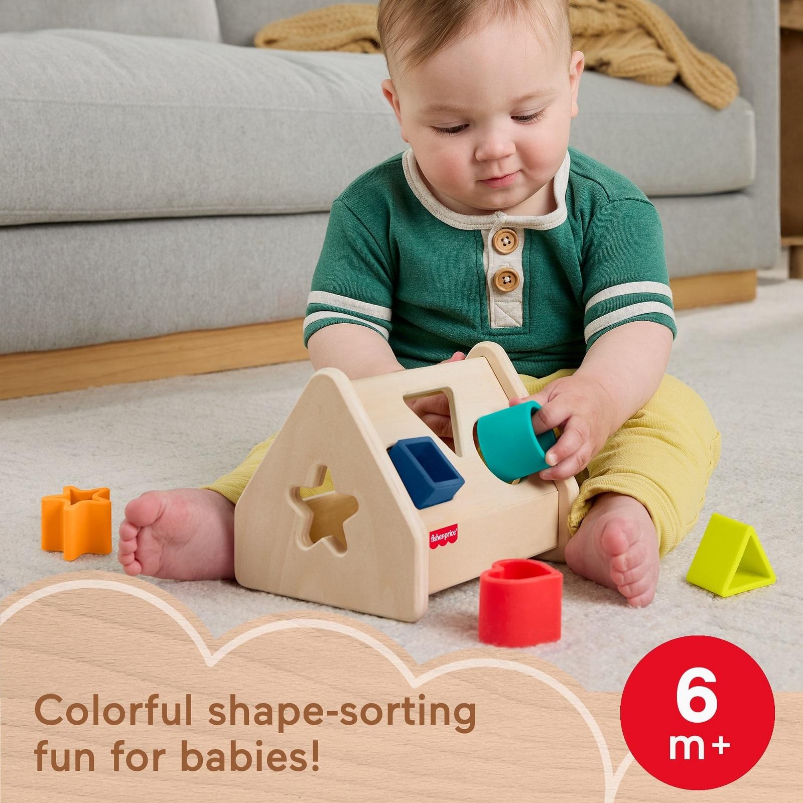 Introduce your baby to shapes and colors with the Wooden Silicone Shape Sorter toy from Fisher-Price. This engaging activity toy includes 5 colorful, easy-to-grasp shapes made from soft, teetheable silicone and a sturdy wooden base made with wood from well-managed, Forest Stewardship Council-certified sources (FSC-N004566).*Features:** Little ones will love sorting the shapes into the corresponding slots on the base, then dumping them out to start the sorting fun all over again.* This shape-sorting toy helps foster problem-solving skills and hand-eye coordination as babies play.* Decorated with non-toxic, water-based paints.* Colors and decorations may vary.* Suitable for ages 6 months+