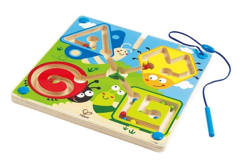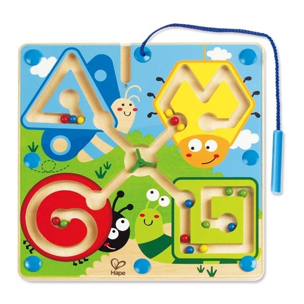 *Hape: Best Bugs – Magnetic Maze*A magnetic wand wiggles and worms marbles through this hand-held maze. Match the marble colors to the bugs. Younger kids can just manipulate the marbles through the maze.*Features:** Use the wand to guide the internal beads to the end of this durable brightly colored maze.* All pieces are enclosed, eliminating a messy clean-up and lost pieces.* A magnetic wand coaxes marbles into every nook and cranny.* Great for travel, as well as for exciting play at home.* Durable child safe paint finish and solid wood construction are hallmarks of Hape toys.*Suitable for ages 2 & up*