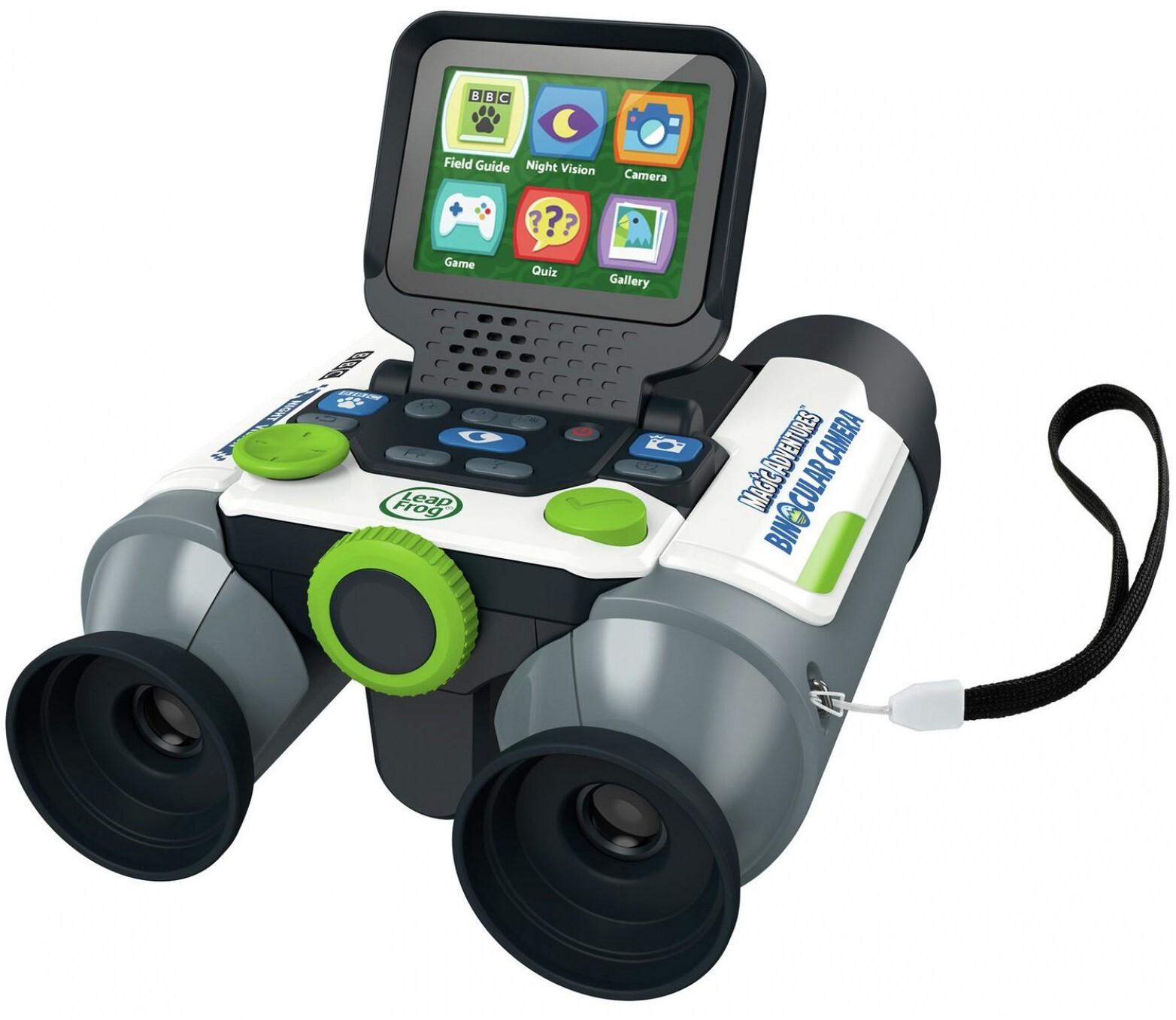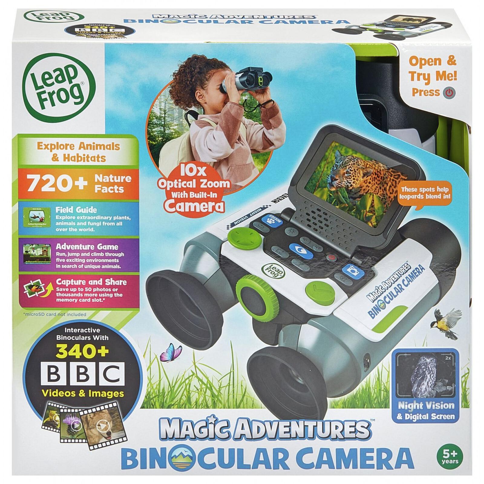 *LeapFrog: Magic Adventures – Binocular Cam*Use the flip up screen to view over 340 real life images and videos provided by the BBC introducing animal and plant features, and habitats from all over the World. Expand your knowledge with over 720 facts in 9 categories including Flowering Plants, Land Mammals, Reptiles and more! Enjoy the fun adventure game where you can search for animals and explore new environments. Capture and share your discoveries with up to 100 photos using the built-in camera, in both daylight and at night and utilise the 10× optical zoom feature.Real Interactive Binoculars to discover plants and animals in your very own back garden.Use the flip up screen with the built in BBC Content – there are over 340 real life images and videos to explore from across the World.Expand your knowledge with over 720 facts over 9 different categories.Capture and share photos using the built-in camera. Activate Camera mode for Day and Night photo captures and use the 10× optical zoom feature.*Features:** Learn shapes & colours* Size H16, W12.5, D6cm.* Weight 468g.* Packaged Size: H24, W25.1, D8.5cm.* BPA Free*Suitable for Ages 3+*_Required: 4× AA Batteries (included).__Required: microSD Card (not included)_