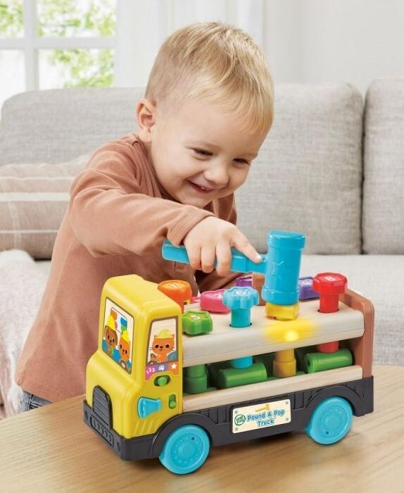 *LeapFrog: Pound & Pop Truck*Grab the hammer and help Wheels the Cat and Hank the Hound complete construction-themed jobs using their wooden truck. Nail down knowledge of numbers, colours and shapes while building coordination skills by playing eight exciting activities.Tap the pegs in number mode to count from 1–8 while hearing silly sound effects. In colour mode, hear colour names and quickly hammer the pegs to score points and light up the lights. Listen for the shapes each customer wants and pound the peg to complete the job. Thanks for your business! The truck is made with 100% FSC-certified wood that comes from well-managed forests.*Features:** Nail your knowledge of numbers, colours and shapes by playing exciting construction-themed games* Tap the pegs in the truck to hammer out motor skills and build coordination while the truck lights up in different colours* Whistle while you work and sing along to songs that sharpen listening skills with Wheels the Cat and Hank the Hound* Truck is made with 100% FSC-certified wood that comes from well-managed forests*Suitable for Ages 2+*_Required: 3× AAA Batteries (included)_