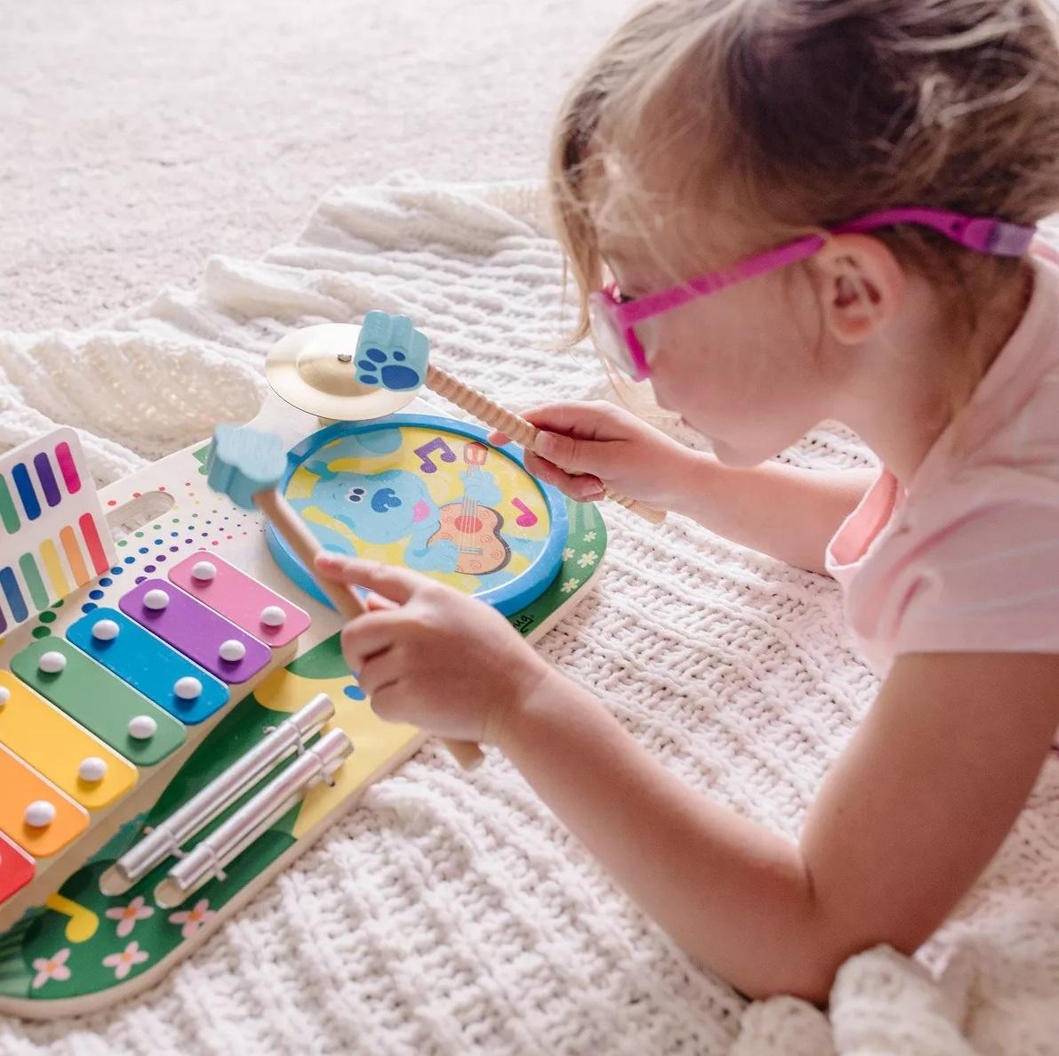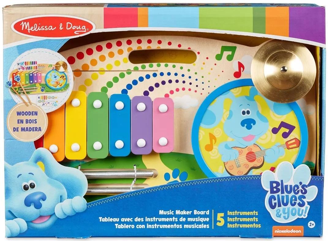 *Blues Clues & You! Wooden Music Maker Board*Make music and keep the beat with Blue from Blue’s Clues & You! The all-in-one take-along wooden music board includes a drum, chimes, cymbal, xylophone, and two paw print-topped mallets that double as a scraper. Kids two and older can follow along with the two double-sided music cards that stand in a slot on the board. The cards and mallets store in the back, and a built-in handle makes it easy to carry anywhere. Blue’s Clues & You! promotes kindergarten-readiness, inspiring confidence, empowerment, and kindness in preschoolers as they develop their problem-solving, social, and developmental skills through play.*Features:** Keep the beat and make music with Blue with this all-in-one take-along wooden music board for kids* Includes drum, chimes, xylophone, and cymbal built into a wooden board, 2 drumsticks, and 2 double-sided music cards* All items store on the board with built-in handle, allowing for easy portability* Blue’s Clues & You! promotes kindergarten-readiness, inspiring confidence, empowerment, and kindness in preschoolers as they develop their problem-solving, social, and developmental skills through play*For Ages 3 & up*