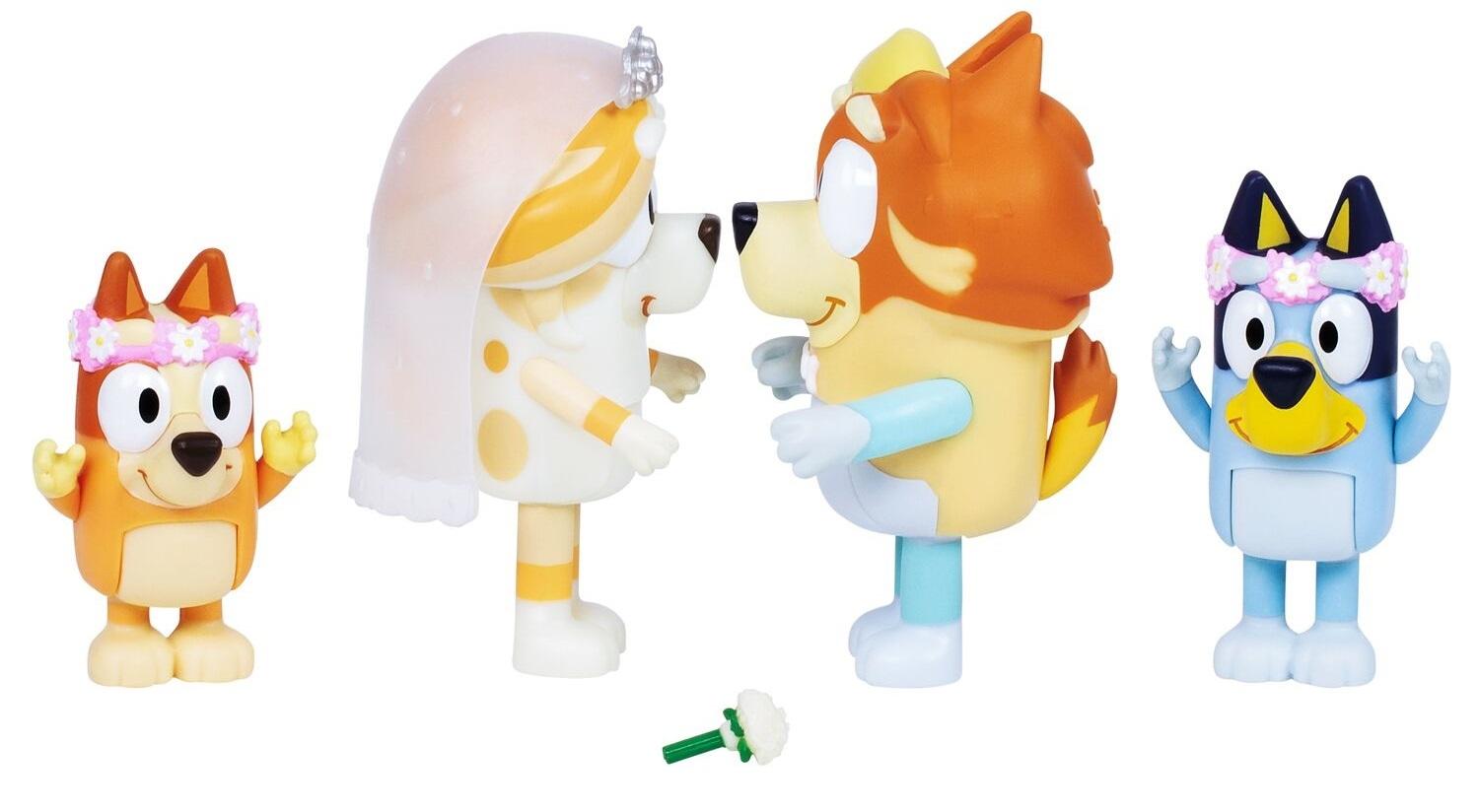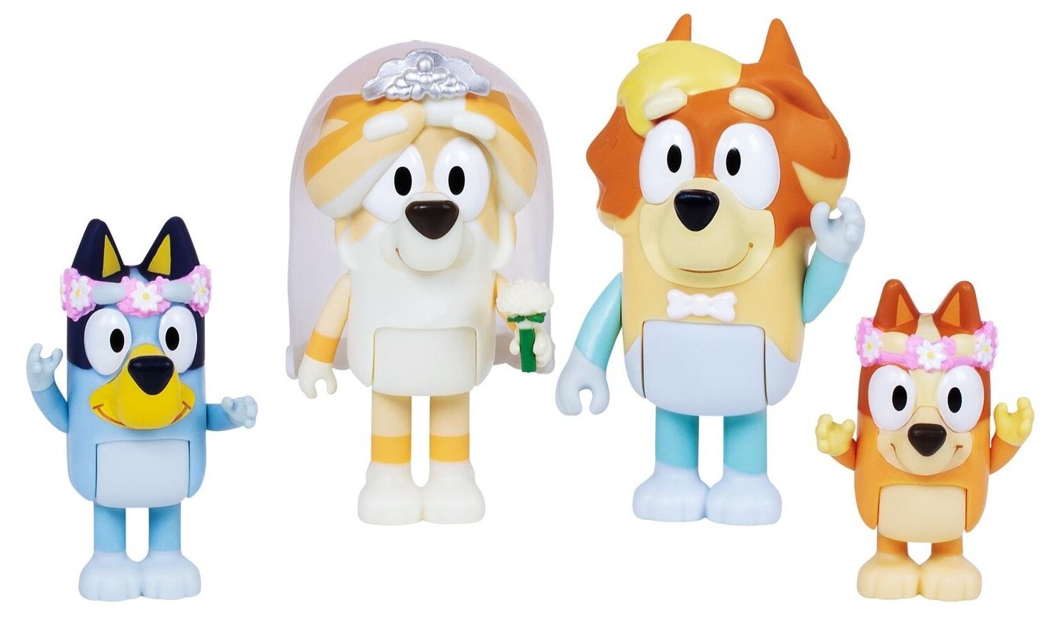 *Bluey: Figure 4-Pack – Wedding Time!*Bluey is a loveable, six-year-old Blue Heeler dog, who loves to turn everyday family life into endless, playful adventures. Bring the fun and imaginative play home with Bluey figures and recreate some of the most memorable moments from the show! These great 4 Figure Packs include an assortment of 4 characters from the TV show.Every 2.5–3 inch Figure in these Packs are articulated and have moving arms and bodies. They are just the right size for pre-school hands to move and play with. Children and toddlers will love to recreate some of the most memorable moments from the show with these adorable Bluey toys!*Features:** The Figures are posable for realistic play!* These figures are the perfect size for pre-schooler hands to play with!* Bring the fun and imaginative play of Bluey with these adorable Bluey 4-Figure Packs!* At 6.4–7.6cm tall, these Figures are the perfect size for pre-schooler hands to play with!*Suitable for ages 3 years and up*