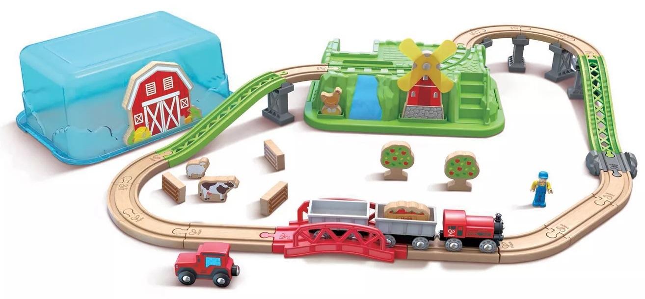 *Gift the little locomotive-lover in your life with the Hape: Countryside Kids Train Track Toy Playset – 41 Piece with Storage Bucket for hours of track-riding fun.*This toy train playset comes in a reusable storage bucket that makes sure no piece goes misplaced. There are 41 pieces in total included in the set, including 4 train cars with magnetic couplers, a winding track, a farmer, trees, cows, and bridges. Each half of the bucket is also functional, with one half featuring a barn decoration against a sky blue background and the other a molded piece of green hilly scenery with its own piece of track that attaches to the other pieces.Made from durable wood, the locomotive toy set is painted in bright, kid-friendly colors that inspire imagination for hours at a time. Inspire a future engineer or conductor with this locomotive playset.*Contains:** Includes a plastic storage bucket to help keep everything organized 41 PIECES:* 41-piece set – Which includes 4 magnetic-coupling train cars and a track.* Tree, livestock, and human figures provide passengers and scenery.* Bucket doubles as landscape and connects to the track