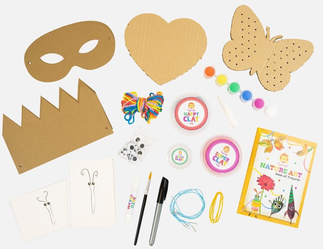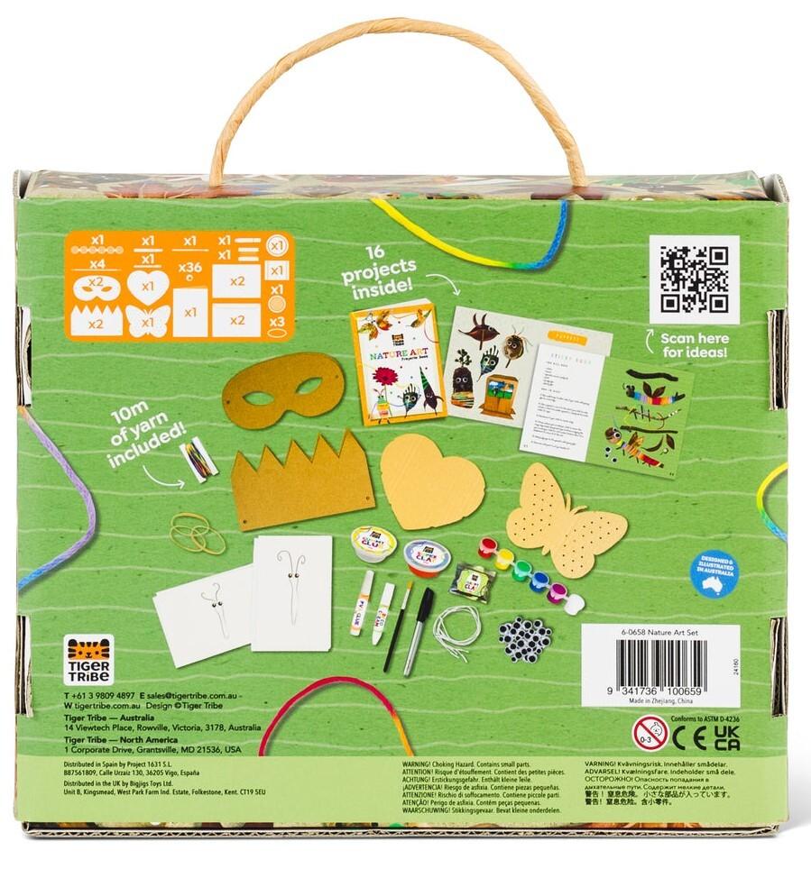 *Tiger Tribe: Nature Art Set*Be inspired with Nature Art Set — a shared (parent and child) activity set that helps turn found natural treasures into creative art projects. Filled with 16 inspiring nature art activities, the set includes EVERYTHING you and your pre-schooler need to get crafty together, including air drying clays, paints and paint brush, recycled paper templates (masks, crowns, butterfly and heart), marker, glue and more! Just add your own nature treasures, including leaves, wild flowers, sticks and colourful feathers.Guided by the activities book and using your found objects and craft materials, you will learn how to make amazing leaf masks and fabulous nature crowns, how to press flowers and create crazy clay critters and so much more. Nature Art Set will fire your child’s imagination and tap into their artistic potential. At the same time nurturing a connection to nature and the environment by encouraging sensory exploration. In addition to the development of fine motor skills, this set also helps kids develop focus and concentration. Nature Art Set is packed full of unplugged, screen-free play value.*Features:** A shared parent and child activity set that turns found natural objects into creative art projects* Unplugged, battery and screen-free portable play* Each set includes a full colour, 32 page Nature Art Activities Book, 1 x pot of Super Clay, 1 x pot of Happy Clay, 1 x pot of Sticky Base, 1 x sheet sticky googly eyes, 6 x mini pots acrylic paint, 1 x paint brush, 1 x threading butterfly, 2 x pre-cut paper mask, 2 x paper crowns, 4 x elastic fasteners, 1 x envelope, 1 x set of rainbow yarn, 1 x tube PVA , 1 x black marker, 1 x tube deco cream* Great for gifting*Suitable for Ages 3+*