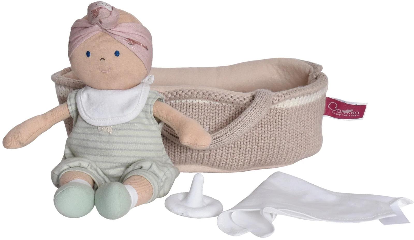 *A beautiful choice for babies, toddlers and older kids alike, our fabric baby doll comes with a cute bandana, knitted carry cot, soother, bib and a blanket.*Designed to help little ones self soothe, these dolls are wonderful and safe choices for babies and toddlers. Older kids will love the experience of looking after the baby which also helps develop empathy and social skills. Soft and cuddly these dolls are a darling choice for little ones.*Features:** Bonikka dolls are developed to represent all communities and come in different skin tones.* The delicately embroidered features and bandana make her a super cute choice.* The lovely, knitted carry cot can be used to transport the baby doll, safe and easy for little ones to carry.* The accessories help keep your little one engaged in taking care of the baby doll.* All baby dolls are made with love* Perfect for children needing a soothing doll or a comforting empathy doll.* Our baby dolls have a lovely soft body which is great for snuggles* Filled with recycled PET fibers making them environmentally friendly as well*Includes:** Carry Cot* Knitted With Baby* Soother And Blanket