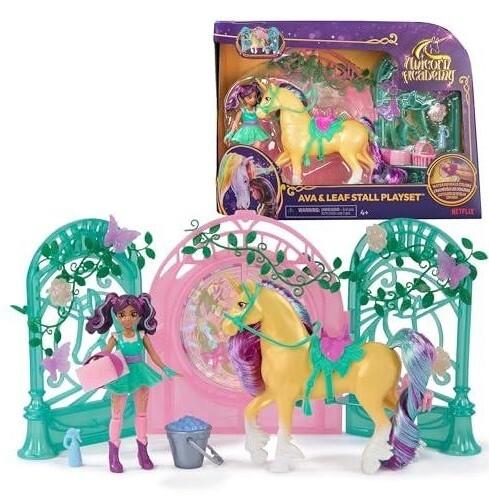 *Unicorn Academy: Ava & Leaf Stall Playset*Based on the popular NETFLIX show and best-selling kids books, this detailed playset includes 4.5 Ava, 5 color-change Leaf 15 accessories*Features:** Recreate Leaf gaining her powers dip the sponge in ice cold water dab on her body to magically reveal Plant Magic markings. Leafs saddle bridle are also removable for added pretend play* Decorate the stall with butterflies, flowers vines. Add to your storytelling with a spray bottle Ava can hold, the sponge, bucket of sky berries for Leaf to snack on brush for Leafs silky mane tail* Build your Unicorn Academy dolls accessories collection with all the rider unicorn sets girl toys each sold separately. Fun unicorn gifts, birthday gifts or gifts for any occasion* Expand your Unicorn Academy world with dolls, unicorns, small dolls, stuffed animals, plushies and more. Exciting unicorn toys for girls age 4–6 and up* Includes: 1 Playset, 1 Doll, 1 Unicorn, 1 Removable Saddle, 1 Removable Bridle, 15 Accessories* Covered by the Spin Master Care Commitment. See below for full details*Suitable for Ages 4+*
