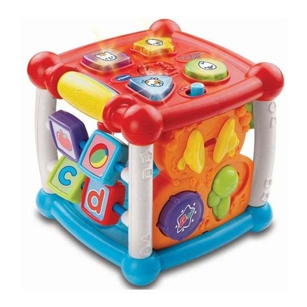 Explore and learn on every side! Learn and play every day with the Turn & Learn Cube by VTech! Featuring 5 sides to explore, this activity cube attracts your baby’s attention with music, chunky light-up buttons, bright colours and more. Light-up buttons introduce animals, animals sounds and shapes.Press or slide the musical instruments to hear their name and sounds, also includes 5 sing-along songs and 20 fun melodies. The cube also features lots of sliding and spinning manipulative features to encourage interaction and a motion sensor that triggers fun sound effects. Encourages motor skill development, imaginative play and language development.* Features 5 sides to explore, this activity cube attracts your baby’s attention with music, chunky light-up buttons, bright colours and more.* Light-up buttons introduce animals, animals sounds and shapes.* Press or slide the musical instruments to hear their name and sounds.* Also includes 5 sing-along songs and 20 fun melodies.* Encourages motor skill development, imaginative play and language development.* Requires 2 x AAA batteries.Suitable for ages 6 – 36 months