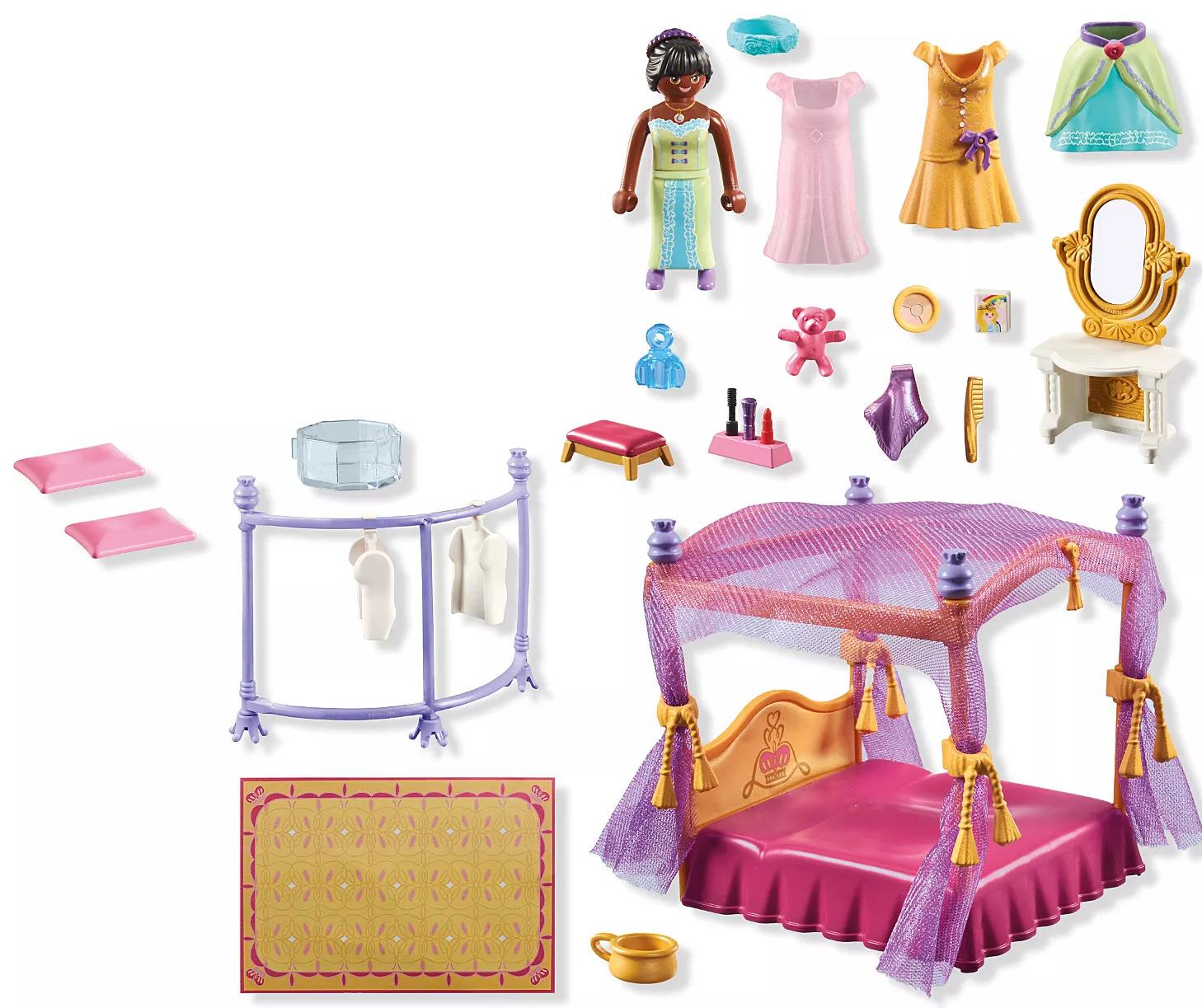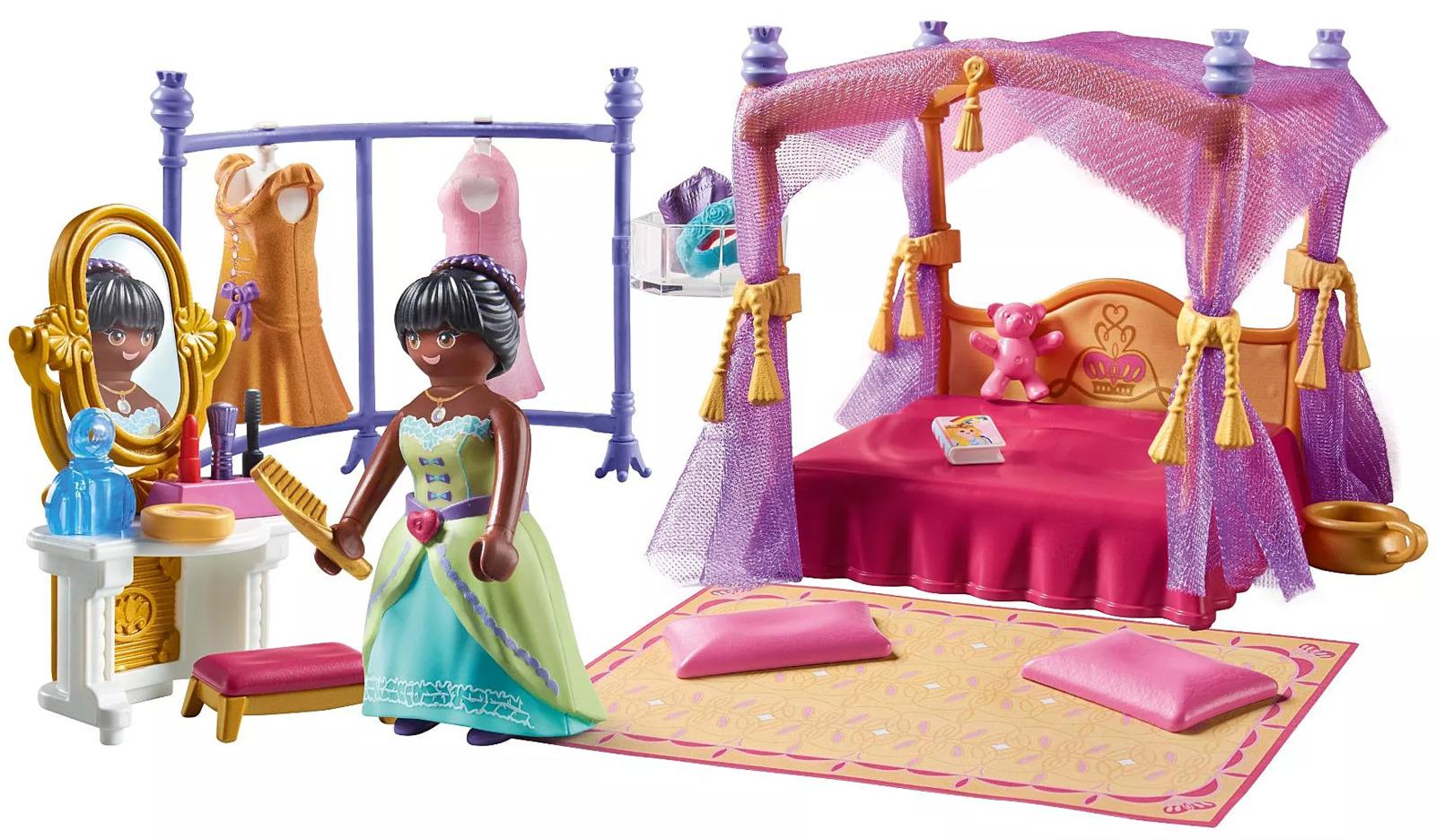 *Playmobil: Bedroom with Dressing Room (71847)*In the princess's canopy bed, you can sleep wonderfully and dream fairy-tale dreams. With the three dresses that can be freely exchanged and hung up, the princess always has the right outfit at hand. The two comfortable cushions invite you to take a short break or have a nice chat between friends. At the elegant dressing table, new looks can be created, preparing the princess for any occasion.Transform the princess's day with this charming PLAYMOBIL bedroom and dressing room set! Create stunning royal looks with the included makeup accessories. The fabric canopy bed, with a teddy bear for bedtime and a stylish dressing table, is perfect for endless fairytale adventures. A delightful addition to the Princess Castle (product number: 71845), this PLAYMOBIL set inspires imaginative play fit for royalty!*Contents:** Figures: 1 princess* Accessories: 1 dressing table with mirror, 1 stool, 1 carpet, 2 seat cushions, 1 bed with fabric canopy, 1 clothes rail, 1 blush, 1 flacon, 1 holder, 1 mascara, 1 lipstick, 1 blush brush, 2 clothes hangers, 2 dresses, 1 skirt, 1 heart pin, 1 hairband, 1 rose hairband, 1 book, 1 teddy bear, 1 cloth, 1 comb*Suitable for Ages 4+*