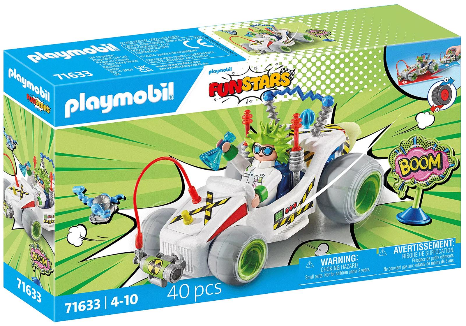*Playmobil: Crazy Kart – Professor (71633)*Get revved up with the PLAYMOBIL Funstars set: Racing Professor, featuring a PLAYMOBIL figure, kart, and loads of cool accessories.On your marks, get set… Without hesitation, the mad professor zooms off in his kart with a retractable motor. Boiling test tubes, electric contraptions, and a beam drive make his kart a scientific sensation that outshines everything else. Exciting races, navigating obstacles, or crazy stunts – the PLAYMOBIL Funstars are on the loose! This wild PLAYMOBIL car is perfect for fans of crazy rides. The futuristic new body can be adorned with various accessories. The vehicle accommodates a PLAYMOBIL figure. Thanks to the practical retractable motor, high-octane action in the playroom is guaranteed. A fantastic gift or souvenir for car-loving children aged 4 and up.*Contents:** Figures: 1 man* Accessories: 1 kart with crazy accessories, 1 shield, 2 laboratory glasses*Suitable for Ages 4+*