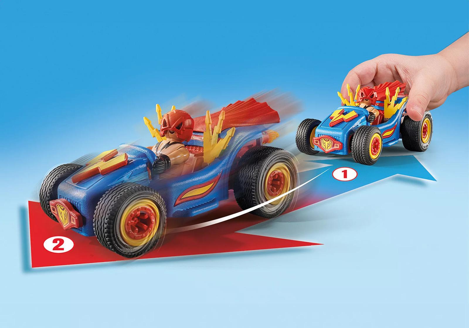 *Playmobil: Crazy Kart – Wrestler (71632)*Exciting PLAYMOBIL Funstars playset Racing Wrestler with one PLAYMOBIL figure, kart and many crazy accessoires.On your marks, get set… Without hesitation, the wrestler zooms off in his kart with a retractable motor. Engage in a race with vivid flashes, fluttering capes, fiery exhausts, effortlessly leaving competitors behind. Exciting races, navigating obstacles, or crazy stunts – the PLAYMOBIL Funstars are here! This crazy PLAYMOBIL car will thrill all wrestling fans. The dynamic new body can be outfitted with various accessories. There's room for a PLAYMOBIL figure inside the vehicle. With the convenient retractable motor, high-speed play adventures are guaranteed. A fantastic gift or souvenir for car-loving children aged 4 and up.*Contents:** Figures: 1 man* Accessories: 1 kart with crazy accessories, 1 shield, 1 trophy*Suitable for Ages 4+*