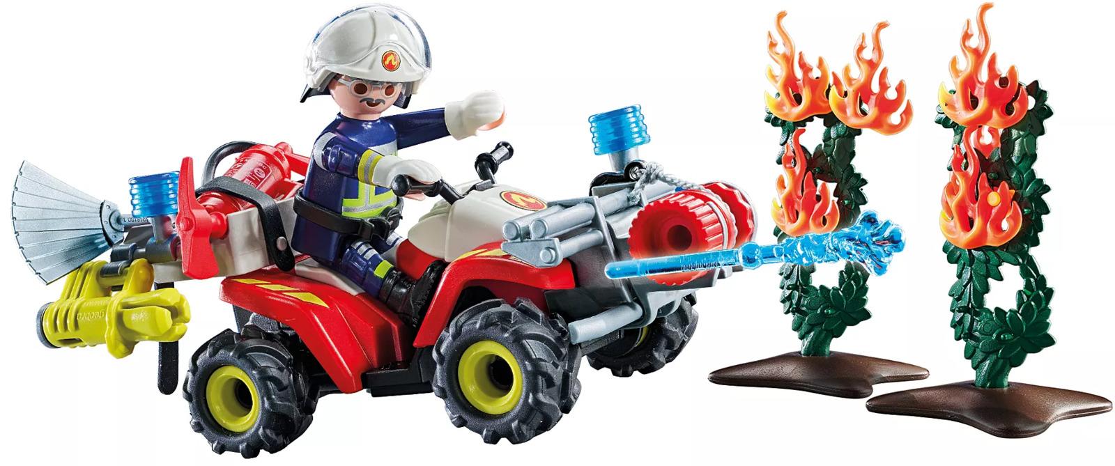 *Playmobil: Firefighting Quad (71825)*Just as quick as his water dart, the fireman is at the scene with his quad with cable winch to extinguish a dangerous hedge fire. The fire is quickly extinguished with the help of the water cannon with firing function.Speed into action with the PLAYMOBIL Quad Fire Brigade! Equipped cable winch and water cannon, this quad is ready for daring missions. The firefighter figure can ride the quad and grip the handlebars, while essential tools like the fire extinguisher and axe attach securely to the rear. Flames clip onto bushes for dramatic play, letting kids create their own heroic rescues. With foldable helmet visors and detailed accessories, this PLAYMOBIL set delivers endless excitement for little firefighters in training!*Contents:** Figures: 1 man with fireman's helmet and 2 gloves* Accessories: 1 quad bike with cable winch and hook, 2 belt attachments, 1 cannon with 2 water arrows, 1 fire extinguisher, 2 axes, 2 small blue lights, 2 bushes with 2 base plates, 4 flames, 1 fire brush*Suitable for Ages 4+*