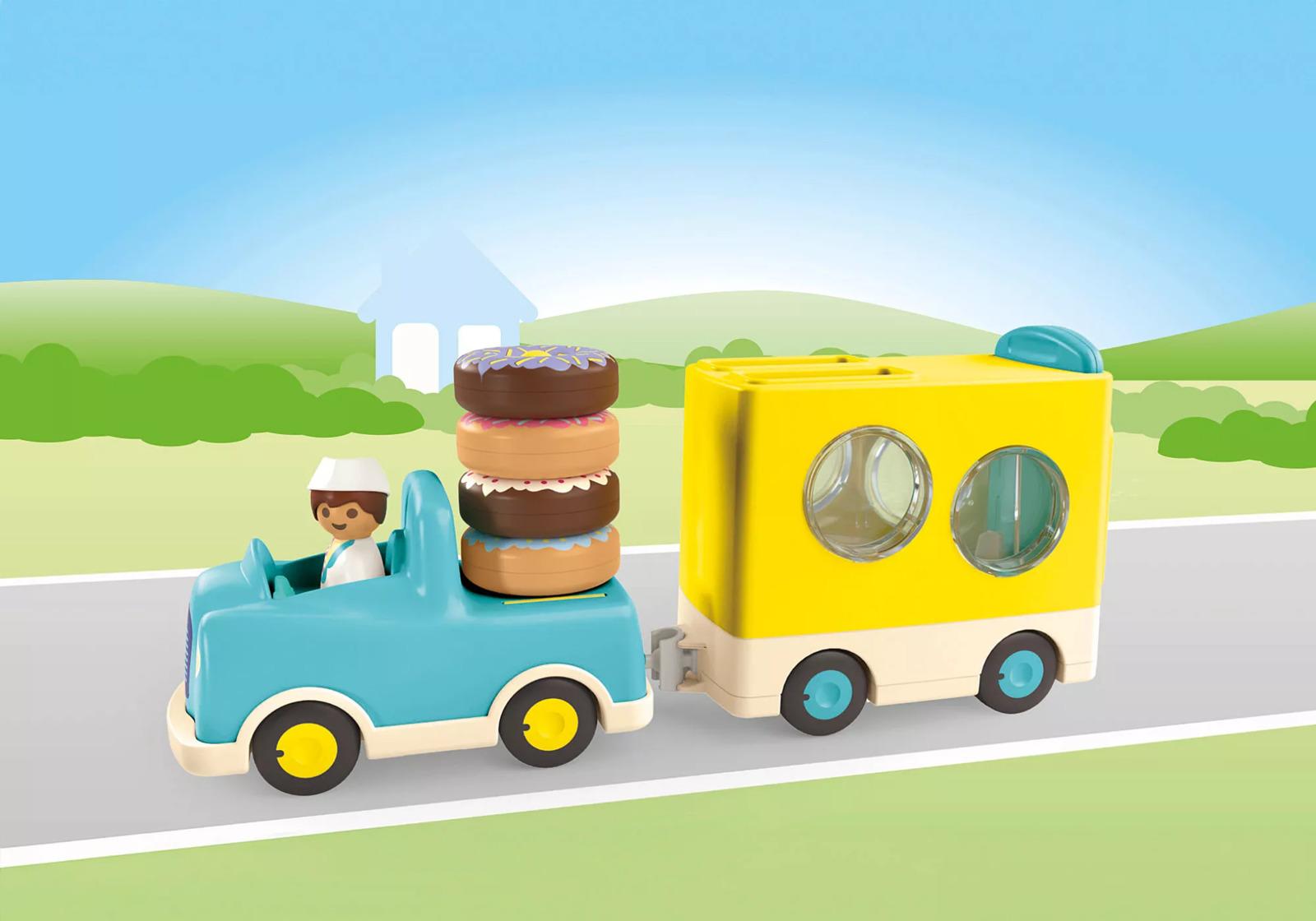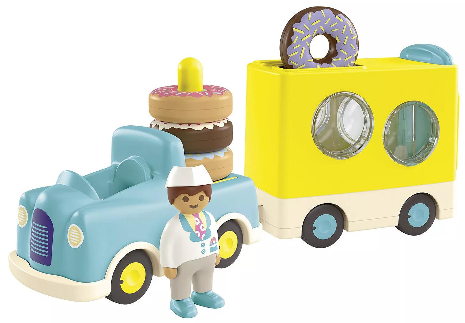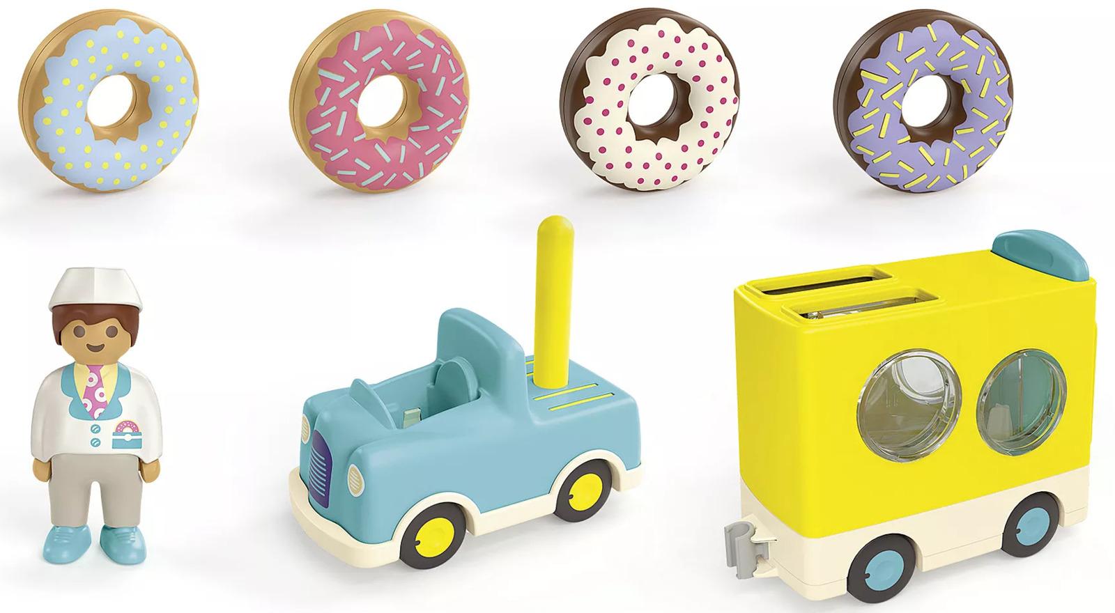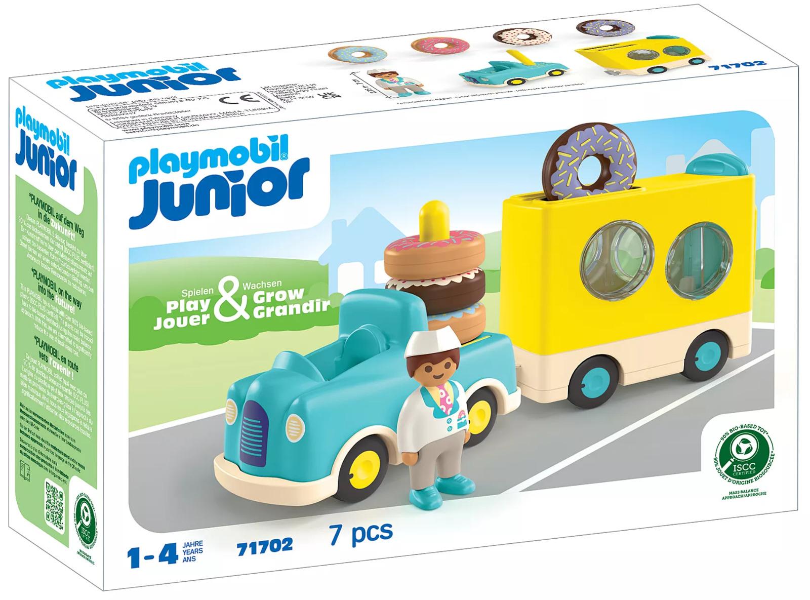 *Playmobil: Junio – Crazy Donut Truck with Stacking (71702)*Yummy, that looks delicious! The donut vendor sets off with his Donut Truck to satisfy the hungry sweet tooths with fresh donuts. Fun donut action in the playroom: With this set, your child can experience the joy of selling, learn about colors, and test their fine motor skills while sorting. Did someone call for a donut?Your child can stack the tasty rings on the back of the vehicle or transport them in the matching trailer. Are the sweet treats securely stored? Then it's time for the ride! Once the donuts are properly sorted, the icing can be seen through the windows. When your child pulls up the rear sliding door, the colorful donuts zoom out. Who ordered which donut? How far do the donuts roll? Who can roll the donuts the farthest? Who helps the donut vendor collect them again?*Contents:** Figures: 1 man* Accessories: 1 truck with trailer, 4 donuts*Suitable for Ages 1+*