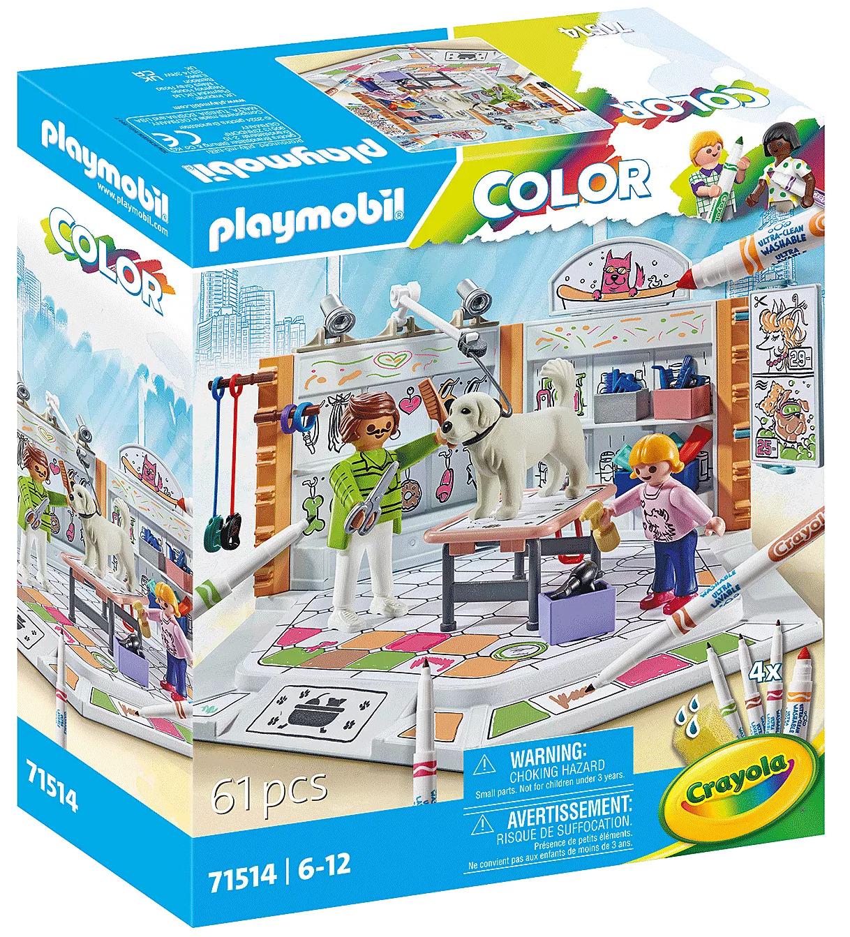 *Playmobil: Color Dog Salon (71514)*Bring color into play with the PLAYMOBIL Color Dog Salon. Unleash your creativity and redesign figures, the store, and labels over and over again.Explore your artistic side with the PLAYMOBIL Color Dog Salon! Young design enthusiasts can get creative, decorating the salon, the dog, and the specially coated labels to their heart's content, easily washing them off for a fresh canvas. The folding table and leash add a touch of realism to the play, while the movable elements bring the grooming activities to life. Shelves are perfect for displaying dog items and grooming products, and the dog with a movable head and mouth eagerly awaits pampering. All colors are easily washable, allowing for endless creations. A sponge is included for minor color corrections. Discover the joy of coloring and designing with PLAYMOBIL Color – endless fun for creative kids!*Contents:** Figures: 1 man, 1 girl* Animals: 1 Newfoundland dog* Accessories: 1 6-corner base plate with 2 shelf wall elements, 1 table, 2 spotlight lamps, 1 wall bracket for dog leash, 1 sign, 1 head sign, various care products and brushes, 1 scissors, 1 hair dryer, 3 dog leash, 5 shelf boxes, 1 sticker sheet paintable and washable, 3 Crayola pens thin, 1 Crayola pen thick, 1 sponge*Suitable for Ages 5+*