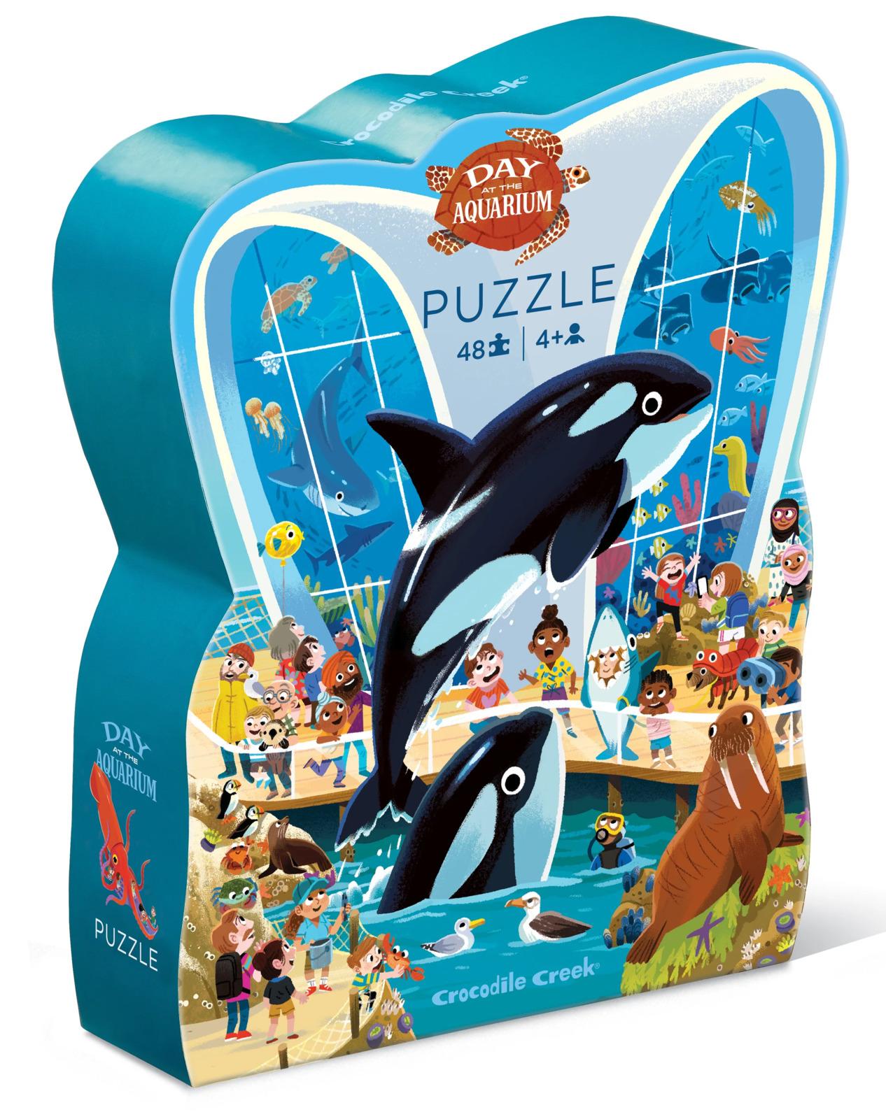 *Crocodile Creek: Day at the Aquarium – 48-Piece Puzzle*Kids Love to Visit the Aquarium! This Crocodile Creek Day at the Aquarium 48 piece puzzle will transport kids to the world of a fun, whimsical aquarium revisiting a favorite aquarium or remembering a wonderful outing with family, friends or classmates! Walk into the great hall be awed by giant fish tanks, sharks, jellyfish and starfish as well as many other wonders of the watery world. This richly detailed 18” x 24” puzzle, features children and families from a variety of backgrounds and is not only interesting and informative but humorous too. Packaged in a uniquely aquarium shaped box, it is guaranteed to delight both kids and parents.*Features:** Crocodile Creek puzzles pieces are made of strong, high-quality blue board.* Puzzles encourage problem solving and foster eye-hand coordination.* All Crocodile Creek puzzles are thoroughly tested to assure they are always kid-safe.* All Crocodile Creek puzzles are made with soy-based inks* paper from Forest Stewardship Council-approved forests* They have no interior plastic packaging.* Puzzle Size – 18” x 24” / 45.72 × 60.96cm*Suitable for ages 4 & up*