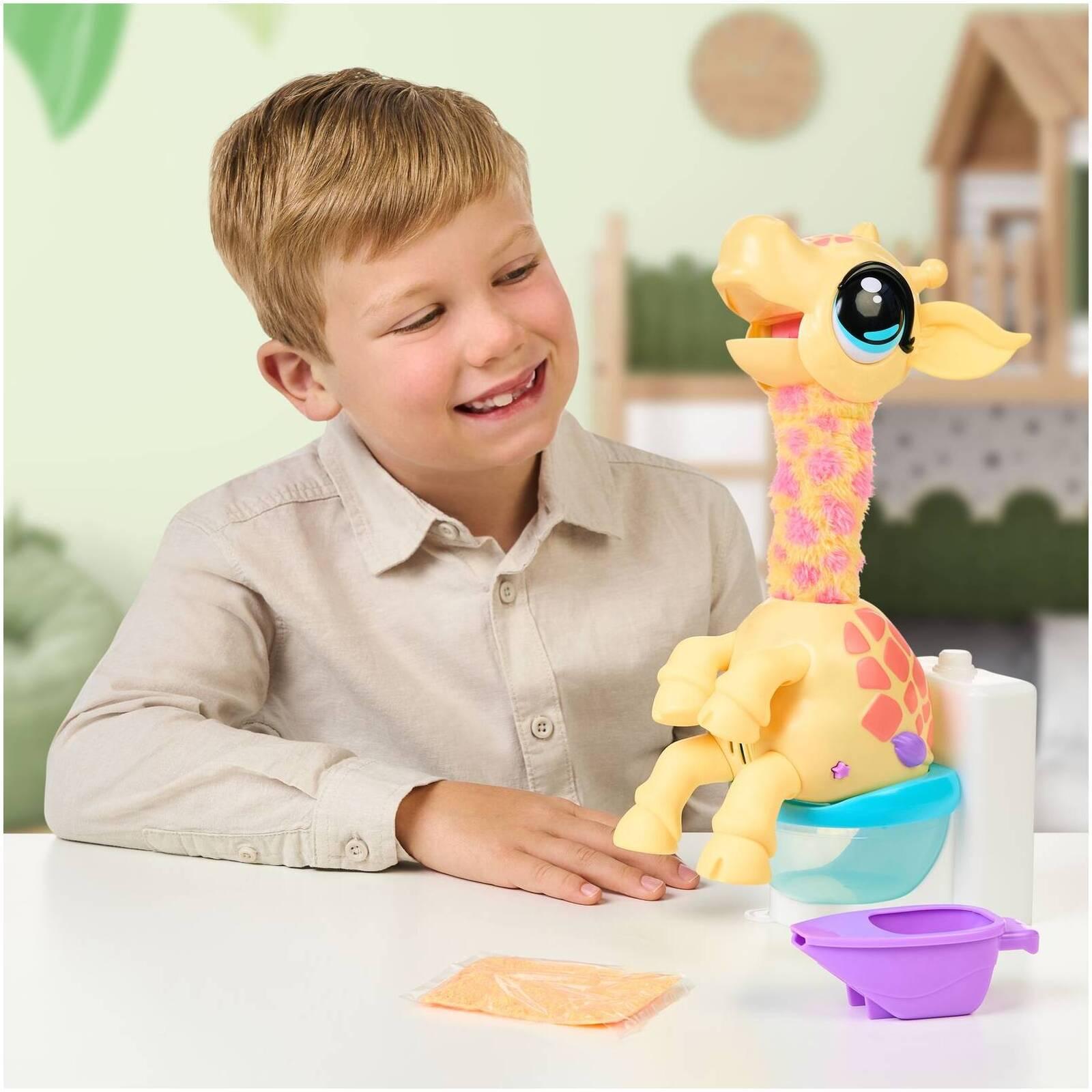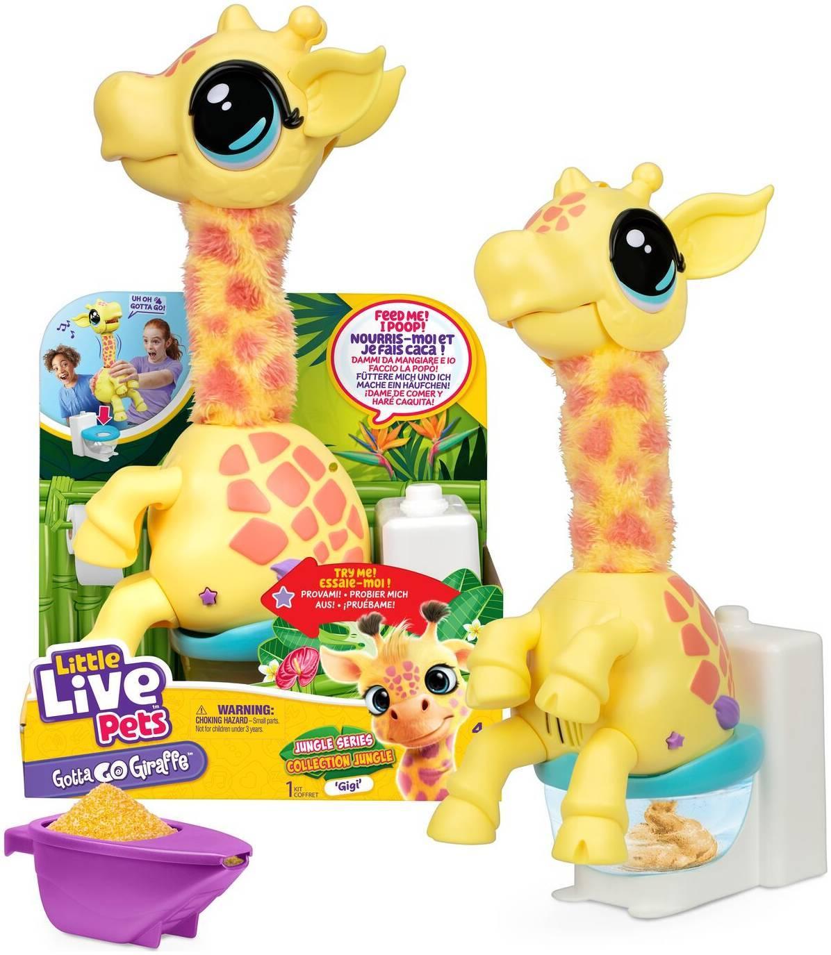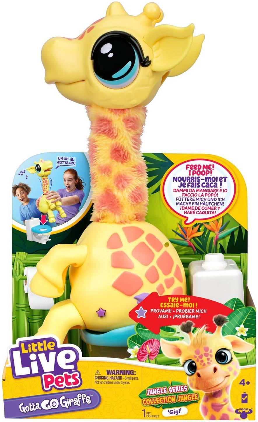 Introducing the new Gotta Go Giraffe from Little Live Pets! Meet Gigi, the most playful and funny toilet-trained giraffe you've ever seen!Watch as Gigi eats the magical food and poops in the toilet bowl for endless entertainment. Gigi is interactive and full of quirky sounds, you won't be able to stop laughing and singing along! Record your voice, and she'll repeat it back to you. Feed Gigi, and she’ll sing “Uh-Oh, Gotta Go!” while pooping into the toilet! Reset the fun and scoop up the poop in the toilet, then feed Gigi some more and watch her do it all over again! Your child will love the silliness of Gotta Go Giraffe from Little Live Pets!*Features:** Funny new best friend: Gigi is so interactive, toilet trained Giraffe who loves to sing, dance, chat back, eat and poop – on the toilet!* Hilarious toilet song: Feed Gigi her Giraffe Food, then listen as she chews and watch as her long neck wiggles. When she sings ‘Uh Oh! Gotta Go!’, you'll know it's time to place her on the toilet and watch as she poops!* Mess-free repeat play: Empty the contents of the toilet bowl back into the scoop and watch as the poop magically dries back into Giraffe food* Repeats what you say: Gigi loves to chat and will automatically repeat what you say. To listen to the last recording again, simply press the yellow star button* Wobbly neck: Watch the fun as Gigi wibble wobbles her neck before pooping on the potty!* Suitable for ages 4+ years