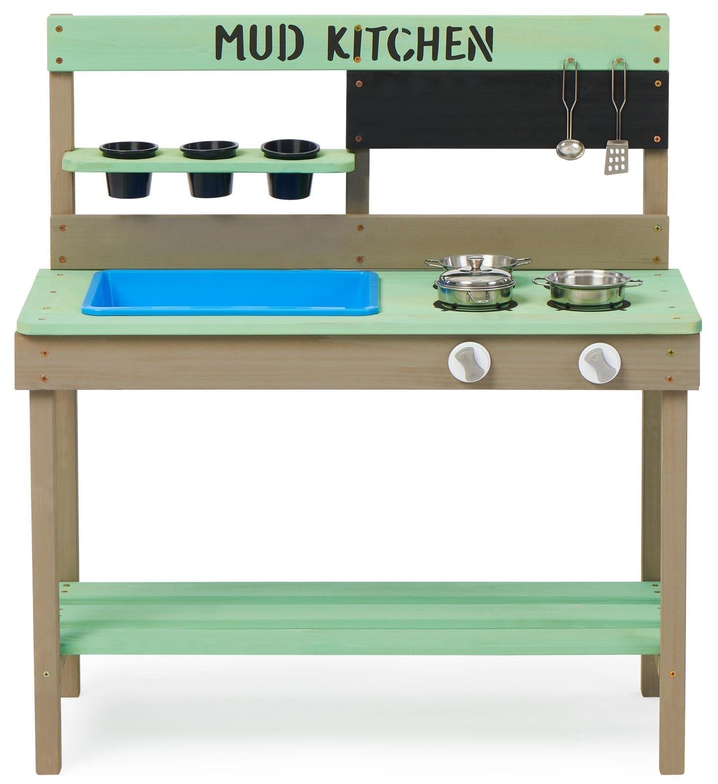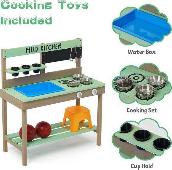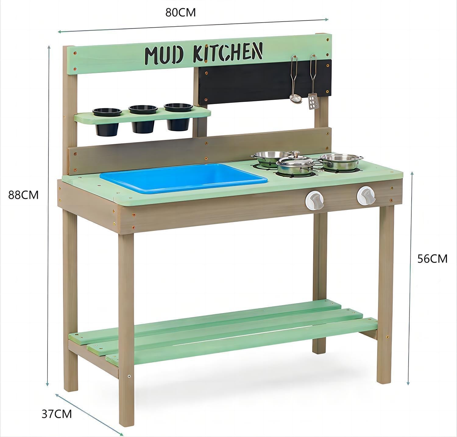 This indoor/outdoor Wooden Mud kitchen set is perfect for any child looking to explore their culinary skills. This model comes equipped with both wet and dry activity areas including stovetop burners, a removable sink, turning knobs, and knob stencils. These details create the look and feel of a typical kitchen without the mess and child-proofing.Constructed from durable fir wood and non-toxic water-based paint, this kitchen set is the perfect size for indoor or outdoor spaces, including a backyard, patio, or lawn. *_NOTE: panels do not come pre-drilled_*Designed to last for years of continuous play and foster coordination, sharing, and sensory skills, this set is sure to keep your child occupied and their imagination running wild for years to come.*Features** Sturdy structure and not easy to fade for long term outdoor use;* Realistic Cooking Experience: clicked turning knobs, stoves, spice shelf, and removable sink;* Ideal Toys and Gifts for toddlers;* Safe materials and non-toxic water-based paint;* Weight Capacity:110lbs*Specification** Product Dimensions (WxHxD): 800×880×370MM* Materials : Fir Wood* Colour : Grey + Light Green* Product Weight : 5.5KG* Product Includes : Warranty , Assembly instruction*WARRANTY*Mighty Ape offers 1 Year Warranty. This warranty covers all manufacturing faults or defects. It does not cover wear, tear, or damage caused by use, accident, or failure to follow care instructions. The warranty is valid for 1 Year from the date of the order and is available to the original purchaser of the product only.